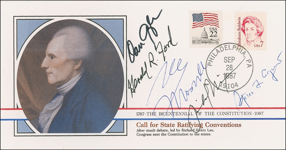Commemorative cover with a cachet honoring the Constitution bicentennial, signed on the front in ink and felt tip by Richard Nixon, Gerald Ford, Walter Mondale, Spiro Agnew, and Dan Quayle. In very fine condition. Pre-certified John Reznikoff/PSA/DNA and RRAuction COA.