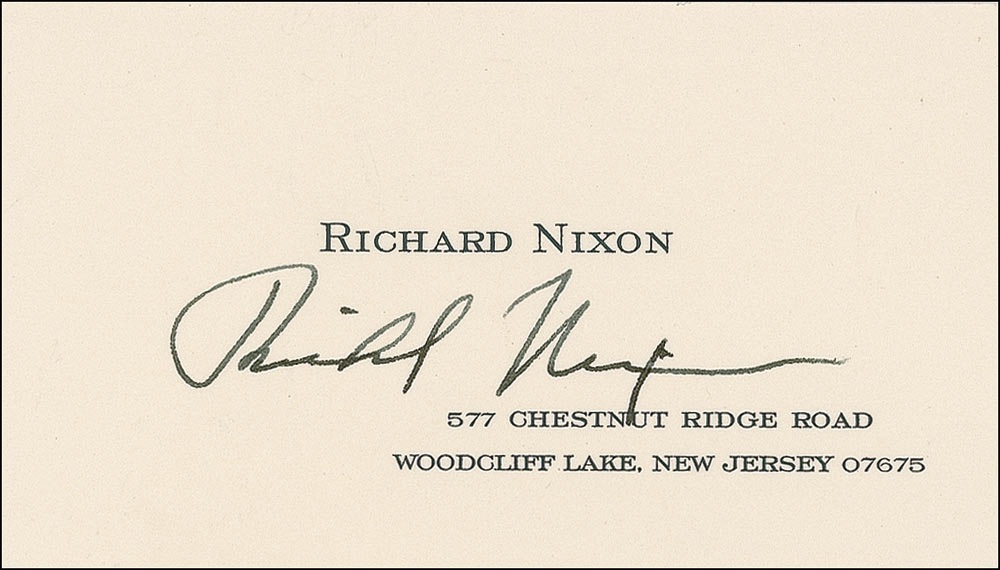 Embossed personal business card bearing Nixon’s name and New Jersey address, signed in black ballpoint, “Richard Nixon.” In very fine condition. Accompanied by a 1989 TLS from Nixon’s assistant forwarding the card, and also accompanied by the original mailing envelope. Pre-certified John Reznikoff/PSA/DNA and RRAuction COA.