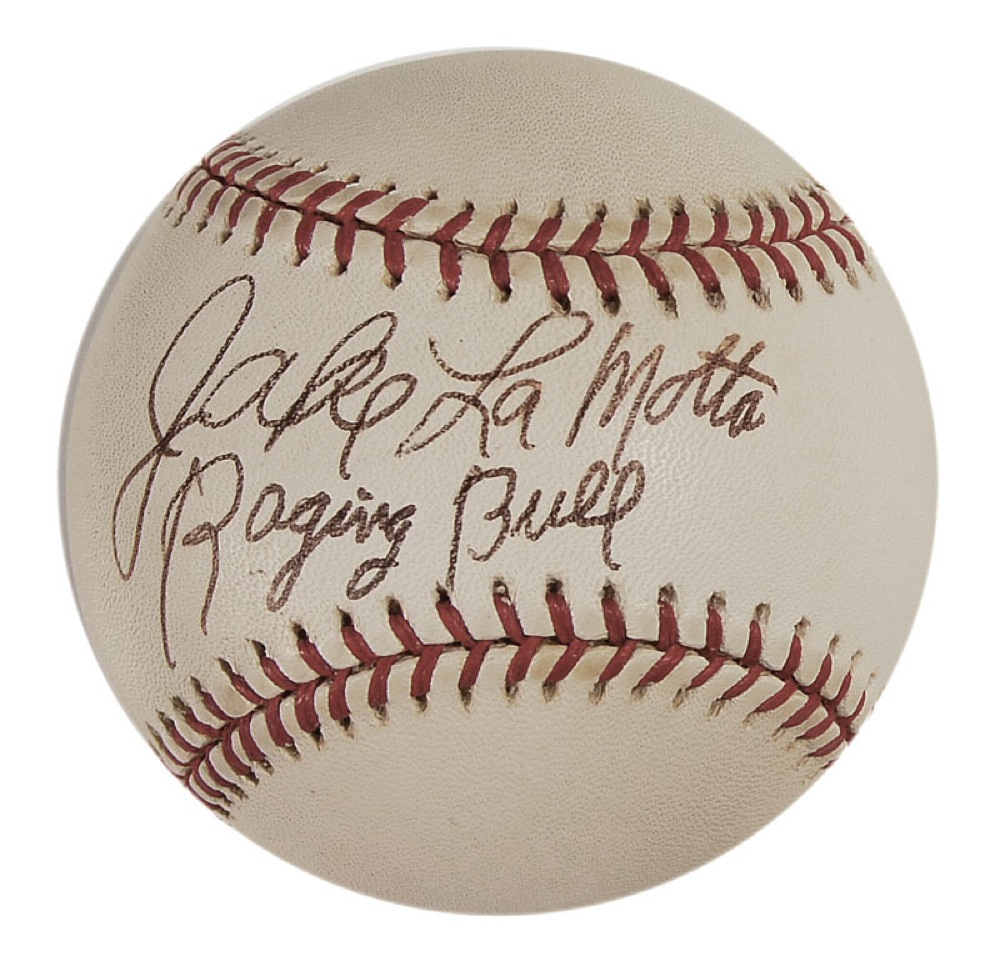 Official Rawlings American League baseball signed in ballpoint on the sweet spot, “Jake LaMotta, Raging Bull.” In fine condition, with a bit of mild toning to ball. Pre-certified Steve Grad/PSA/DNA and RRAuction COA.