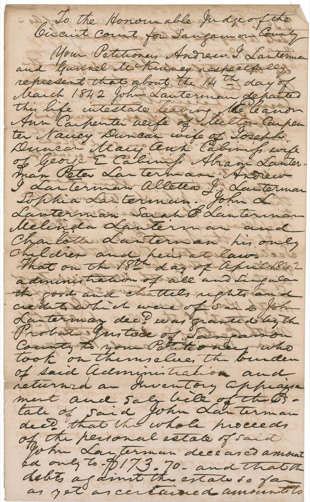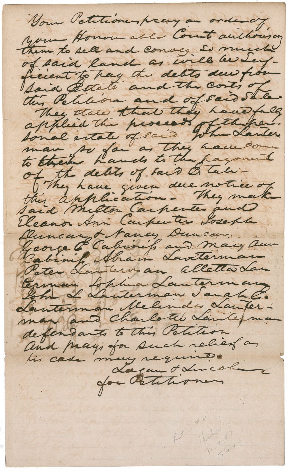 American lawyer (1800–1880) who was the friend and law partner of Abraham Lincoln. Manuscript DS, signed “Lincoln & Logan,” three pages on two lightly lined 7.5 x 12.5 sheets, 1842. A brief filed with the Circuit Court judge of Sangamon County outlining the settlement of debts and sale of lands by the heirs of John Lauterman. In part: “The whole proceeds of the personal estate of said John Lauterman deceased amounted only to-$173.70-and that the debts against the estate so far as yet ascertained amounted to $307.63.” Accompanied by a typescript on Lincoln Library [Shippensburg, Pa.] letterhead. In good to very good condition, with light toning, show-through of writing, a few small pencil notations, and separations along folds. An uncommon offering from Lincoln’s first law partner. RRAuction COA.