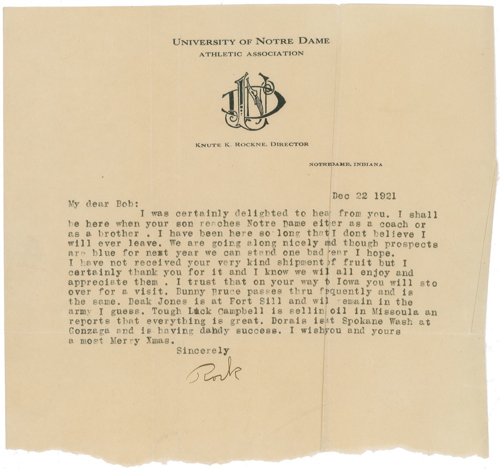Fabled college football coach (1888–1931). Rockne not only made Notre Dame the country’s leading football center, but also revolutionized football theory, stressing offense, organizing the precision backfield of Notre Dame shift, perfecting line play, and developing many stars, including the most famous backfield of all time, the “Four Horsemen of Notre Dame.” He died in a plane crash at the age of forty-three. TLS signed “Rock,” one page, 8 x 7.75, Notre Dame letterhead, December 22, 1921. Letter to Bob. In part: “I was certainly delighted to hear from you. I shall be here when your son reaches Notre Dame either as as coach or as a brother. I have been here so long that I don’t believe I will ever leave. We are going along nicely and though prospects are blue for next year we can stand one bad year I hope.” In very good condition, with several vertical creases and wrinkles, rough bottom edge, and intersecting mailing folds. Rockne had just finished a 10-1 season for the Irish, and despite his fears in this letter, Notre Dame would finish 8-1-1 in 1922. Rockne would also get his wish to stay at Notre Dame, but tragically cut short in 1931. Pre-certified Steve Grad/PSA/DNA and RRAuction COA.