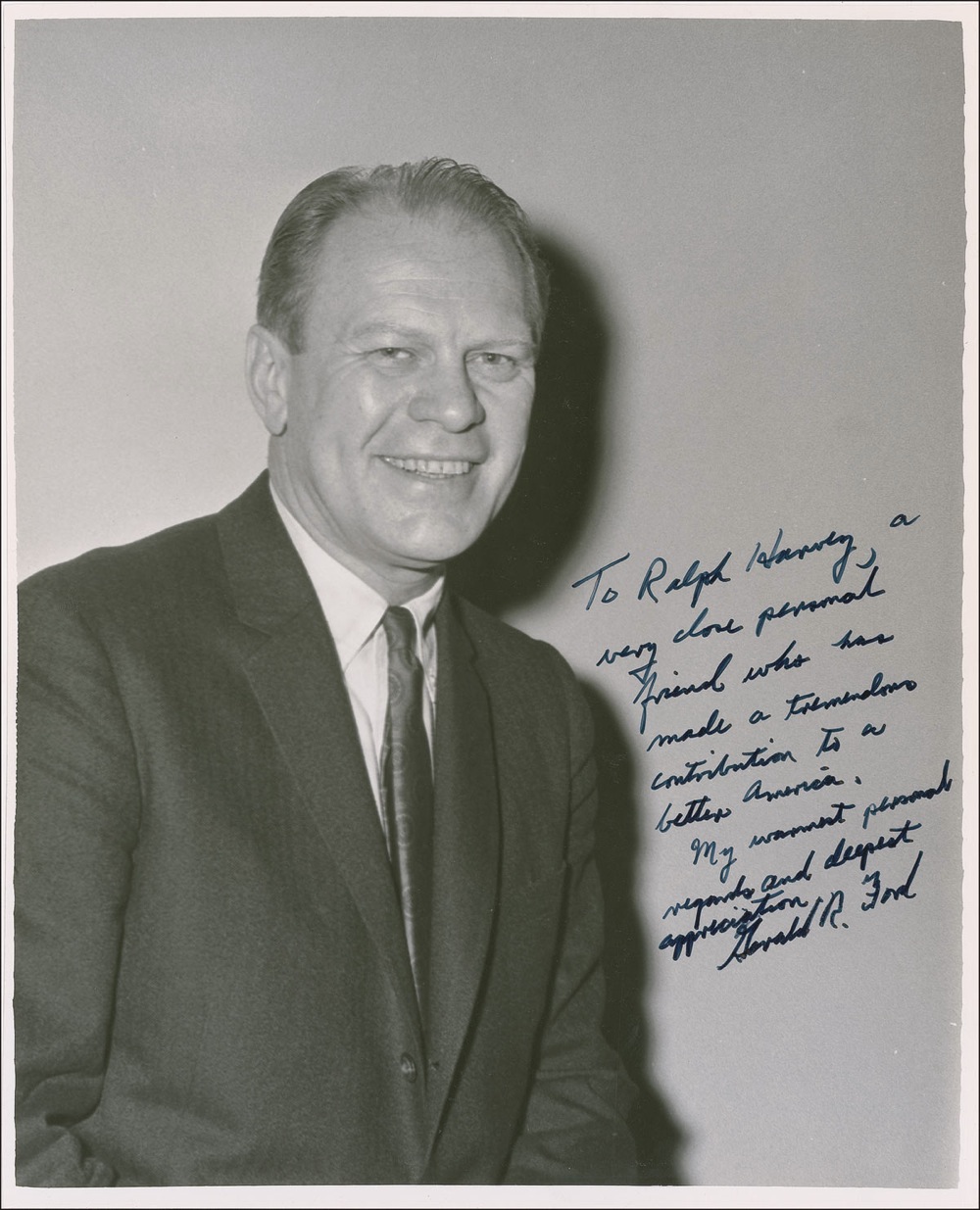 Vintage glossy 8 x 10 photo, signed and inscribed in fountain pen “To Ralph Harvey, a very close personal friend who has made a tremendous contribution to a better America. My warmest personal regards and deepest appreciation. Gerald R. Ford.” In fine condition, with some scattered light surface marks and impressions, and some light crazing to finish. RRAuction COA.
