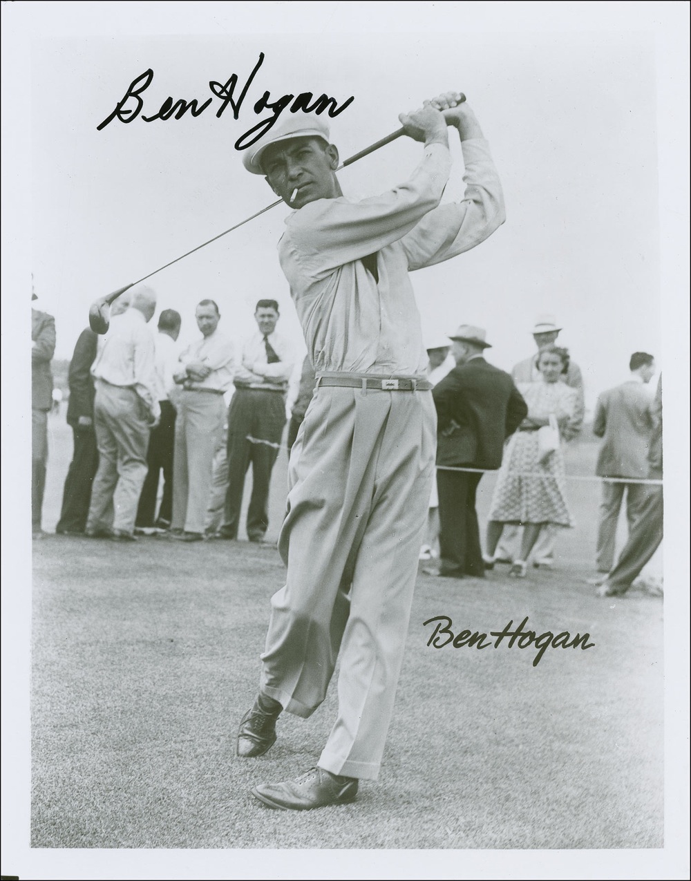 Glossy 8 x 10 photo of Hogan teeing off, signed in black felt tip. In very fine condition. Pre-certified Steve Grad/PSA/DNA and RRAuction COA.