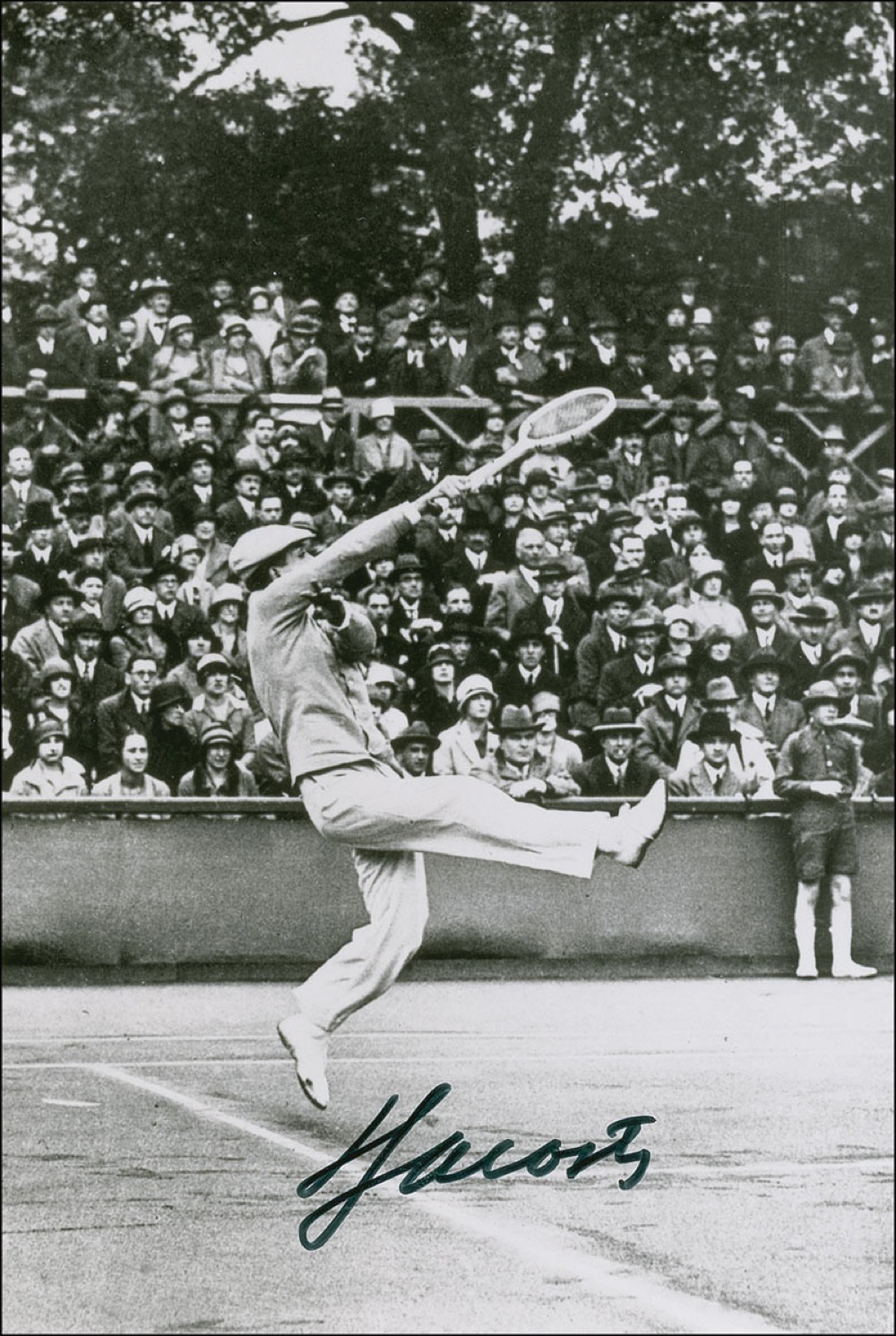 Two items: Satin-finish 4 x 6 photo of Lacoste on the court, signed in black felt tip; and a page from the Encyclopedia of Sports, signed over his image in blue felt tip. In fine condition. Pre-certified Steve Grad/PSA/DNA and RRAuction COA.