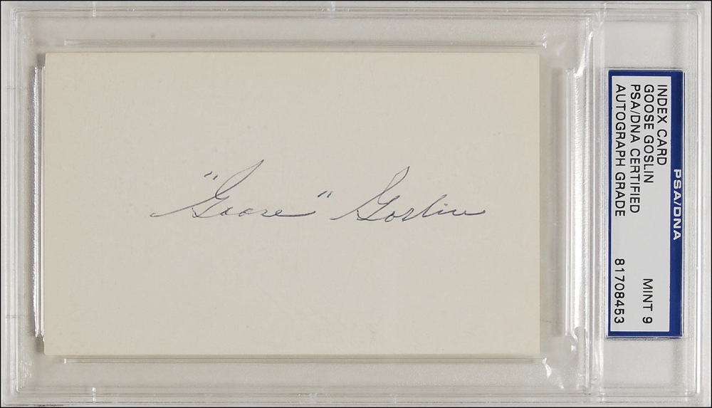 Vintage fountain pen signature “‘Goose’ Goslin” on an off-white 5 x 3 card. Encapsulated in a plastic PSA/DNA authentication holder, grading the signature MINT 9. In fine condition. RRAuction COA.