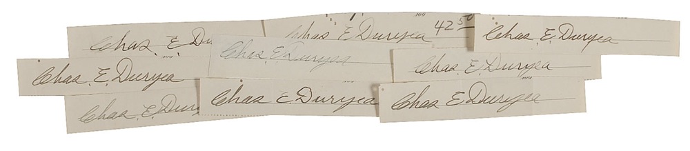 Co-creator (1861–1938) with his brother, Frank, of the first commercially produced automobile. Nine vintage fountain pen signatures, "Chas. E. Duryea," clipped from checks or documents. In overall fine condition, with some handling wear and a few with tiny punch holes approaching his name. RRAuction COA.