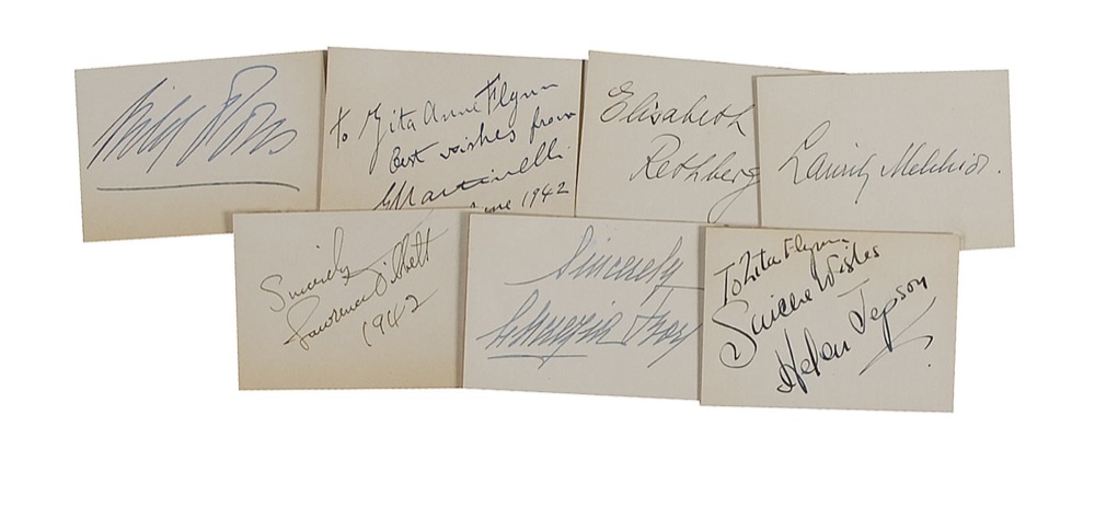 Vintage ink signatures of seven opera stars on individual off-white 3.5 x 2.5 cards. Signers are: Lily Pons, Lauritz Melchoir, Lawrence Tibbett, Lucrezia Bori, Elisabeth Rethberg, Giovanni Martinelli (ins), and Helen Jepson (ins). Scattered toning to several of the cards, otherwise fine condition. RRAuction COA.