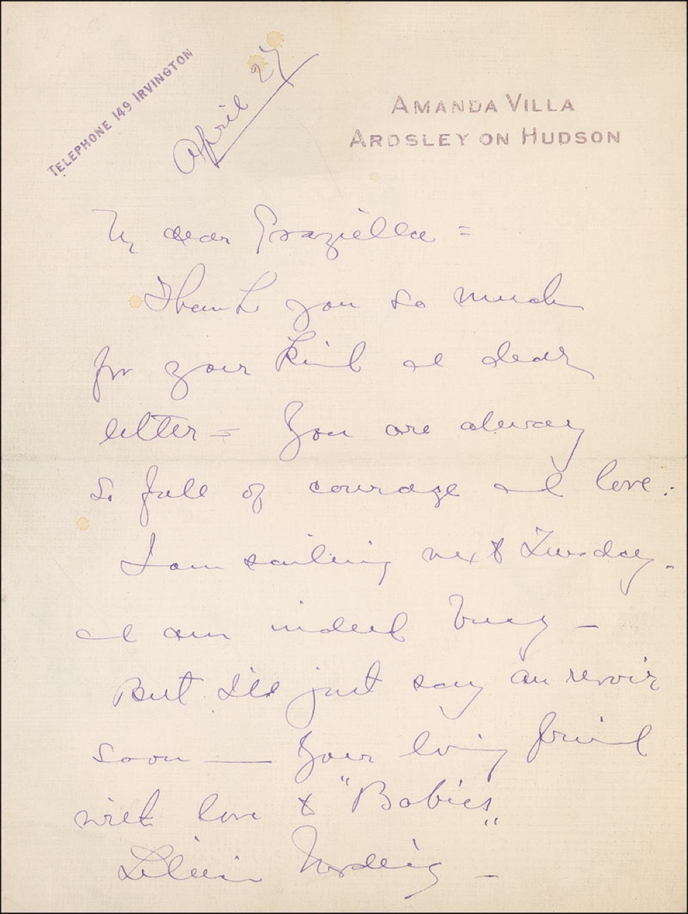 Opera singer (1857–1914) who had a major stage career in Europe and the United States. ALS, one page, 5.75 x 7.75, Amanda Villa letterhead, April 27 [no year]. In part: 'Thank you so much for your kind and dear letter—your are always so full of courage and love. I am sailing next Tuesday and am indeed busy—but I’ll just say au revoir soon.' In very good condition, with mild creasing and scattered toning. RRAuction COA.
