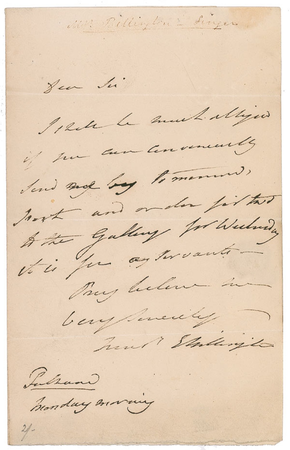British opera singer (1765–1818). ALS signed 'E. Billington,' one page, 4.5 x 7.25, no date. In part: 'I shall be much obliged if you can conveniently send me by tomorrow’s post an order…to the gallery for Wednesday.' In fine condition, with some toning and soiling. RRAuction COA.