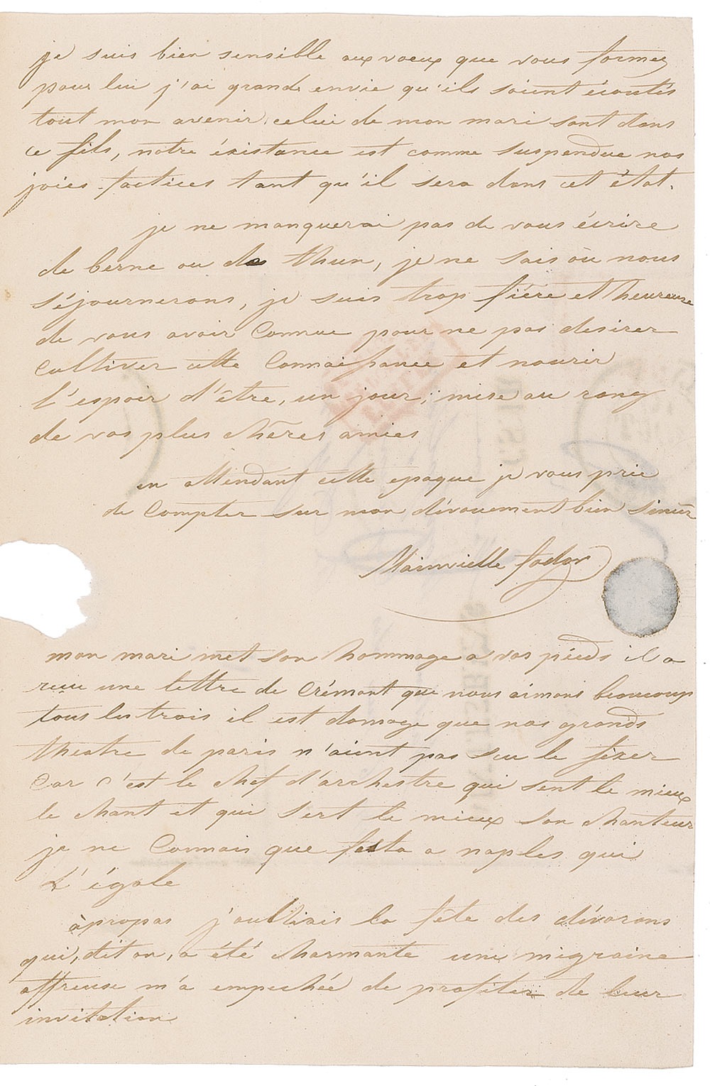 French soprano (1789–1870). ALS in French, signed 'Mainvielle Fodor,' three pages on two adjoining sheets, 5.25 x 7.75, no date. Lengthy untranslated letter to an unidentified recipient. Hole in the middle of the third page not affecting text and light intersecting folds, otherwise fine condition. RRAuction COA.