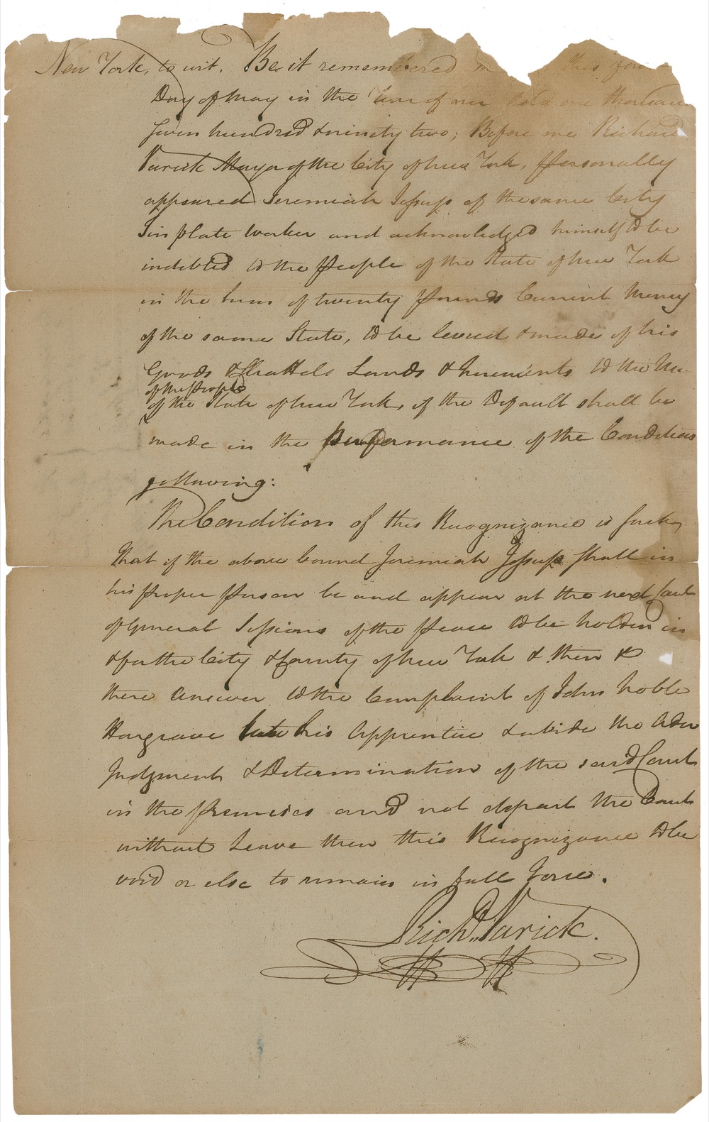 American soldier and statesman (1753–1831) who was aide-de-camp to Benedict Arnold prior to the latter's defection to the British. Varick later served as Washington's private secretary, mayor of New York, and a New York state legislator. DS, signed "Rich. Varick," one page, 8.5 x 12.5, May 14, 1796. The last page of a New York-related legal document. In very good condition, with partial separations along the folds, a few holes, show-through from writing on opposing sides, moderate staining at the top right side and a missing top piece of the page both affecting text. RRAuction COA.