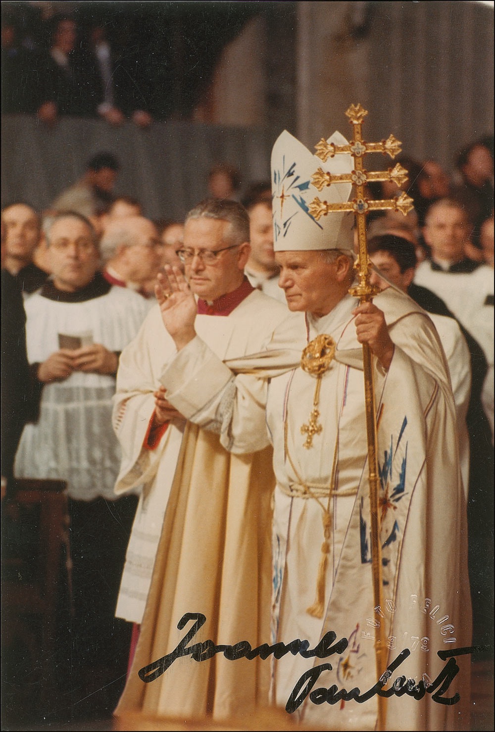 Born Karol Wojtyla in 1920, John Paul II served as the 264th Pontiff of the Roman Catholic Church from 1978 until his death in 2005. Color glossy 4 x 5.75 photo, signed in black felt tip, "Joannes Paulus II." Photo also bears an embossed photographer's stamp to lower right corner. In fine condition, with portion of signature over embossed stamp, slight show-through from writing on reverse along bottom, and some scattered light surface marks. Accompanied by the original mailing envelope bearing a 2001 Vatican postmark. A desirable image of one of history's most popular popes. RRAuction COA.