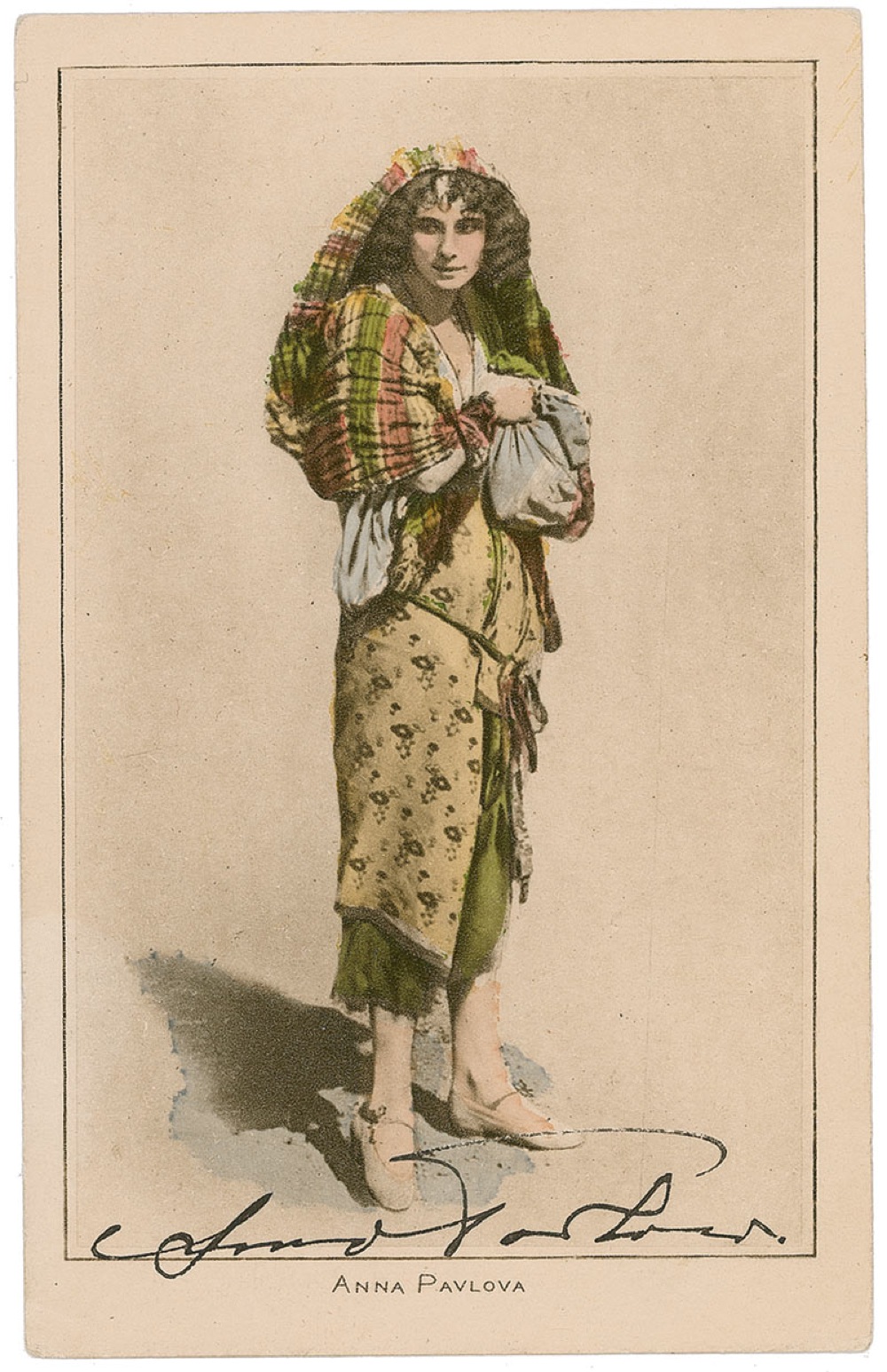Russian-born prima ballerina (1881–1931) who won international fame for her exquisite interpretations of classical roles. Fantastic vintage 3.5 x 5.5 postcard photo of Pavlova in an ornate costume, neatly signed in fountain pen. In fine condition, with a few scattered areas of light soiling. Pre-certified PSA/DNA and RRAuction COA.
