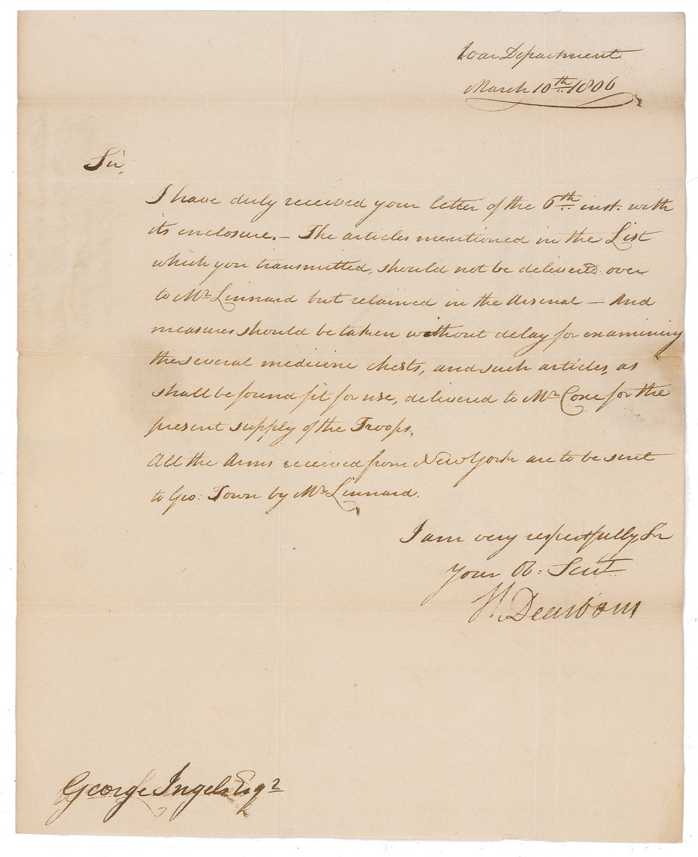 General (1751–1829) during the Revolutionary War and the War of 1812 who served as Secretary of War under Thomas Jefferson. LS signed "H. Dearborn," one page, 8 x 10, March 10, 1806. Dearborn, as secretary of war, writes George Ingels in Philadelphia. In part: "The articles mentioned in the list which you transmitted should be be delivered…but retained in the arsenal." Intersecting folds, a few creases, and scattered toning and soiling, with a horizontal fold and toning touching his signature, otherwise fine condition. RRAuction COA.