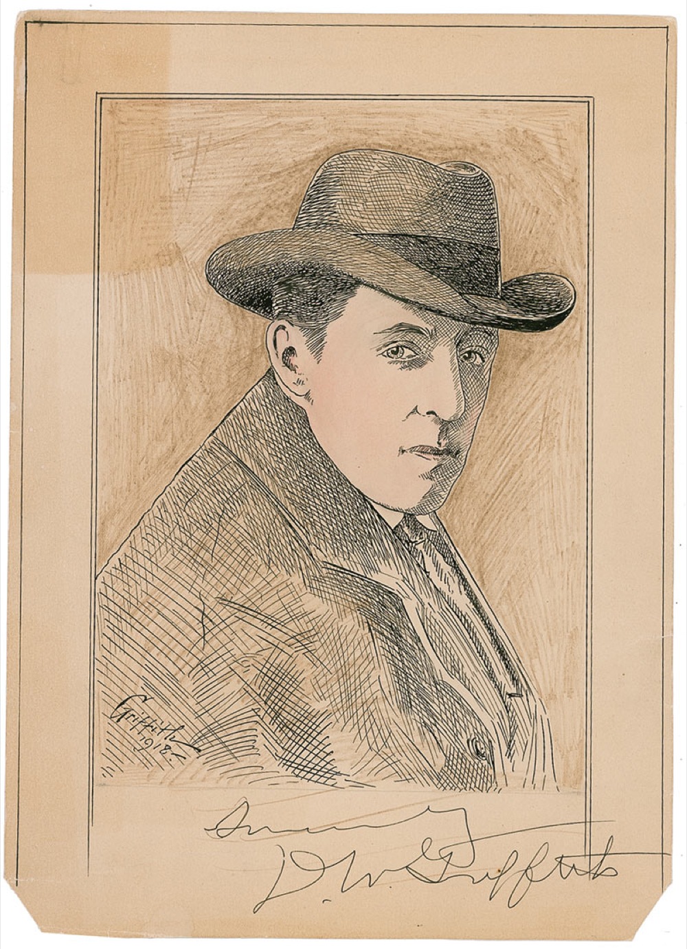 Trailblazing filmmaker (1875–1948) who directed a number of important early classics, including Intolerance (1916) and the iconic (and still-controversial) Birth of a Nation (1915). His innovative use of the fledgling medium resulted in a repertoire and vocabulary of film technique that remains influential to this day. Original signed ink-and-colored sketch of Griffith on a 9 x 12.5 sheet. Boldly signed on a blank area along the bottom, “Sincerely, D. W. Griffith.” In very good condition, with creasing (touching the start of Griffith’s name), a few tiny spots of staining, paper clip impression at the top edge, cut bottom corners, and an irregular block of heavy toning at the top left corner. Pre-certified PSA/DNA and RRAuction COA.
