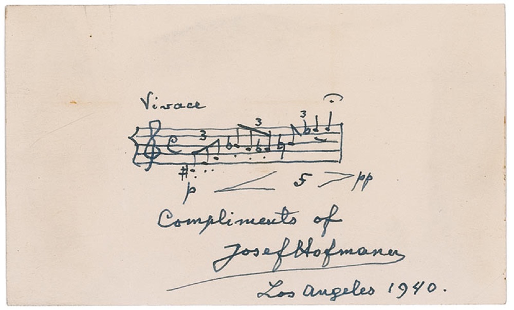 Child prodigy (1876–1957) who later became one of the world's famous pianists and pedagogues. AMQS on an off-white 5 x 3 card. Hofmann pens a detailed bar from an unidentified work, labeled at the top 'Vivace!,' and signed underneath, 'Josef Hofmann, Los Angeles 1940.' In fine condition, with some mild toning from adhesive remnants on reverse. RRAuction COA.