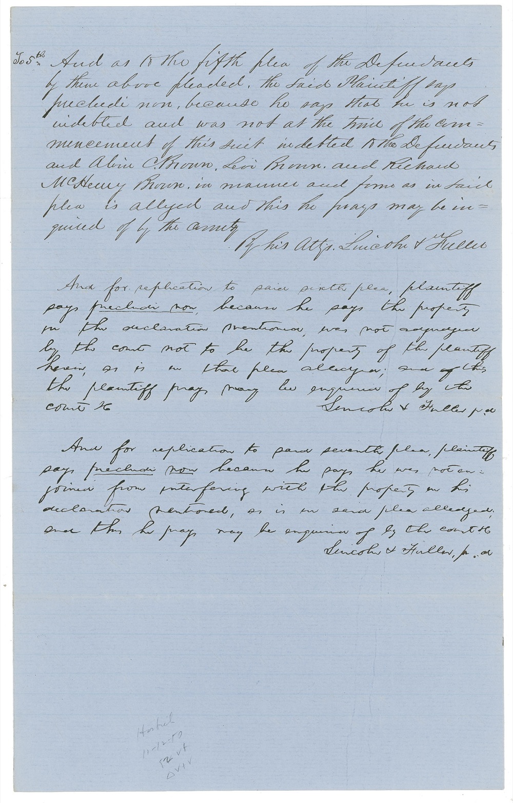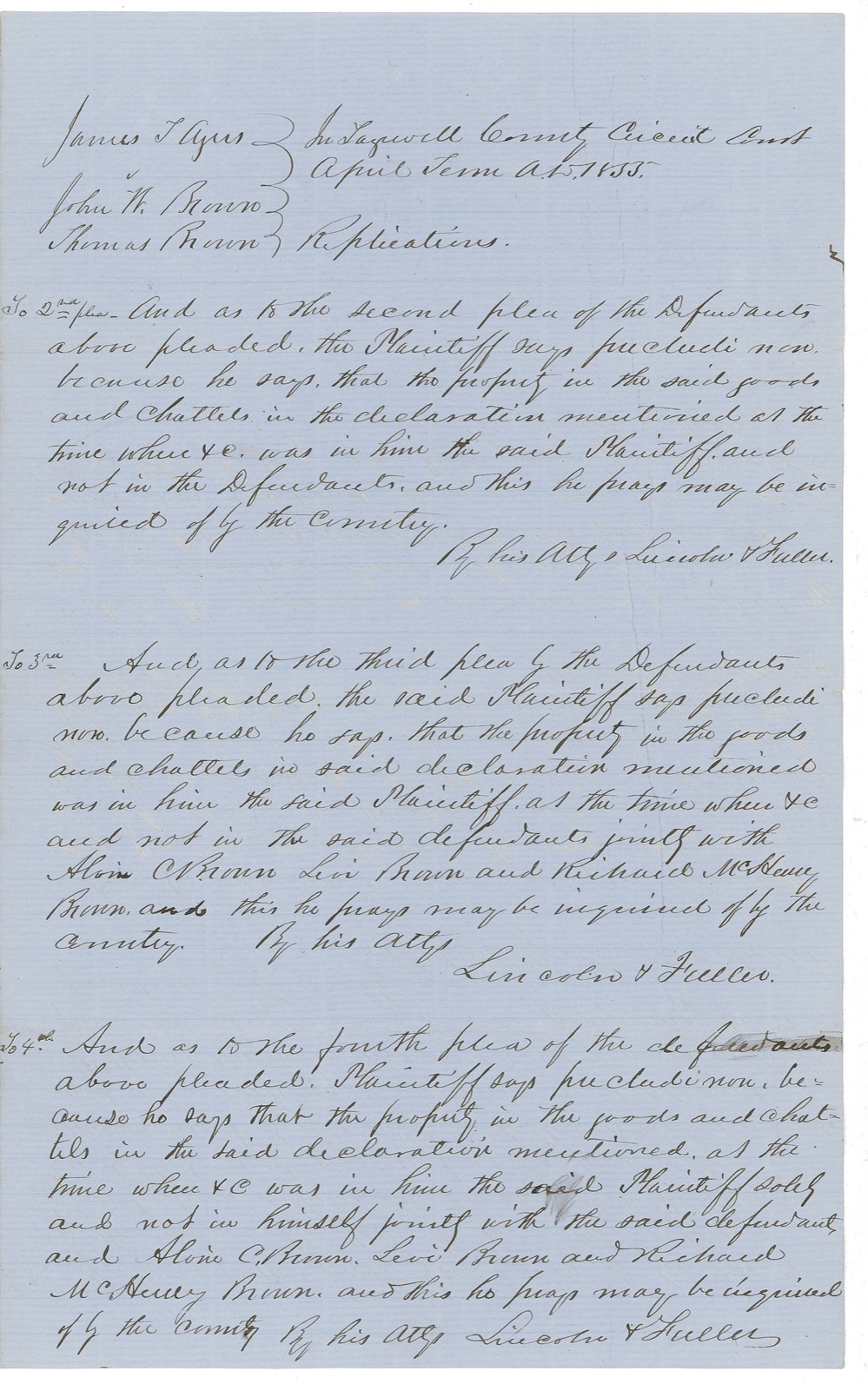 Manuscript DS, with final two paragraphs written in Lincoln’s hand, signed twice by Lincoln, “Lincoln & Fuller p.d.,” one page both sides, 8 x 12.75, April 1855. A plea in the case of James T. Ayers vs. John W. Brown and Thomas Brown. Lincoln writes the final two paragraphs of this legal brief for the sixth and seventh plea. In part: “And for replication to said sixth plea, plaintiff says precludi non, because he says the property in the declaration mentioned, was not adjudged by the court not to be the property of the plaintiff herein, as is in that plea alleged; and of this the plaintiff prays may be enquired of by the court & c. Lincoln & Fuller p.d.” In fine, clean condition, with several horizontal folds, and some scattered light discoloration to page. All of Lincoln’s text is clear and boldly penned. Pre-certified John Reznikoff/PSA/DNA and RRAuction COA.