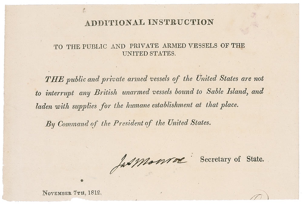 War-dated DS, signed “Jas. Monroe,” one page, 7.75 x 5.25, November 7, 1812. Directives to “the public and private armed vessels of the United States.” In full: “Additional Instruction to the Public and Private Armed Vessels of the United States. The public and private armed vessels of the United States are not to interrupt any British unarmed vessels bound to Sable Island, and laden with supplies for the humane establishment at that place. By Command of the President of the United States.” Several light folds and creases, trimmed and slightly uneven bottom edge, and a pin hole to top edge, otherwise fine condition.