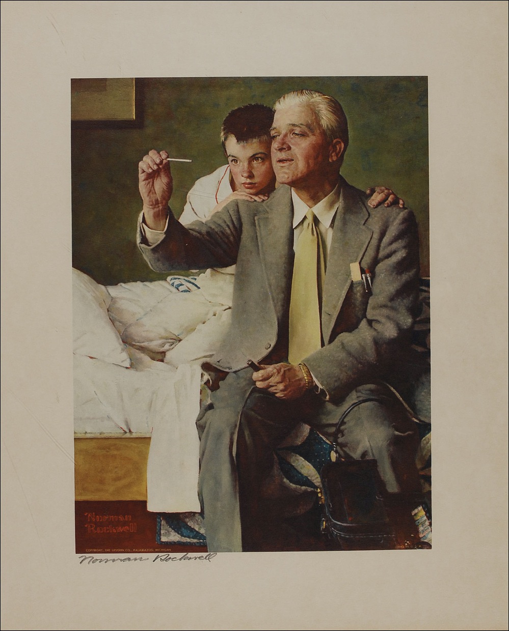 Color 15.5 x 19 lithograph entitled 'Doctor and Boy Looking at Thermometer,' signed in pencil, "Norman Rockwell." Rolled and in fine condition, with faint toning at the extreme edges and a tiny chip at the lower left corner. Pre-certified PSA/DNA and RRAuction COA.