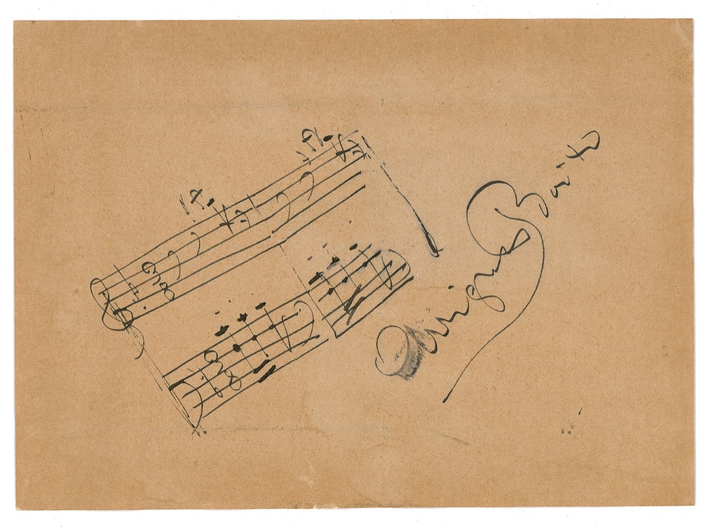 Italian composer and librettist (1842–1918) best known for the opera Mefistofele. AMQS on an off-white 6.75 x 5 sheet. Boito pens two very intricate bars of music, signed underneath, 'Arrigo Boito.' In very good condition, with light brushing to first name of signature, two horizontal folds, and one central vertical fold, passing through first letter of signature, and overall light toning. Accompanied by an unsigned 5 x 7 portrait. RRAuction COA.