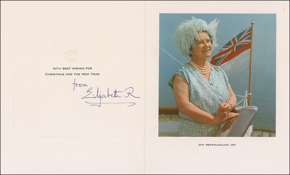 Christmas card from 1967, measuring 7.5 x 9.25 closed and bearing a gold-embossed crown on the front. Inside bears a color 6.25 x 6.5 image of Elizabeth "off Newfoundland 1967." Opposite the photo is a pre-printed Christmas sentiment and signed in blue ink, "From Elizabeth R." In fine condition. Pre-certified PSA/DNA and RRAuction COA.