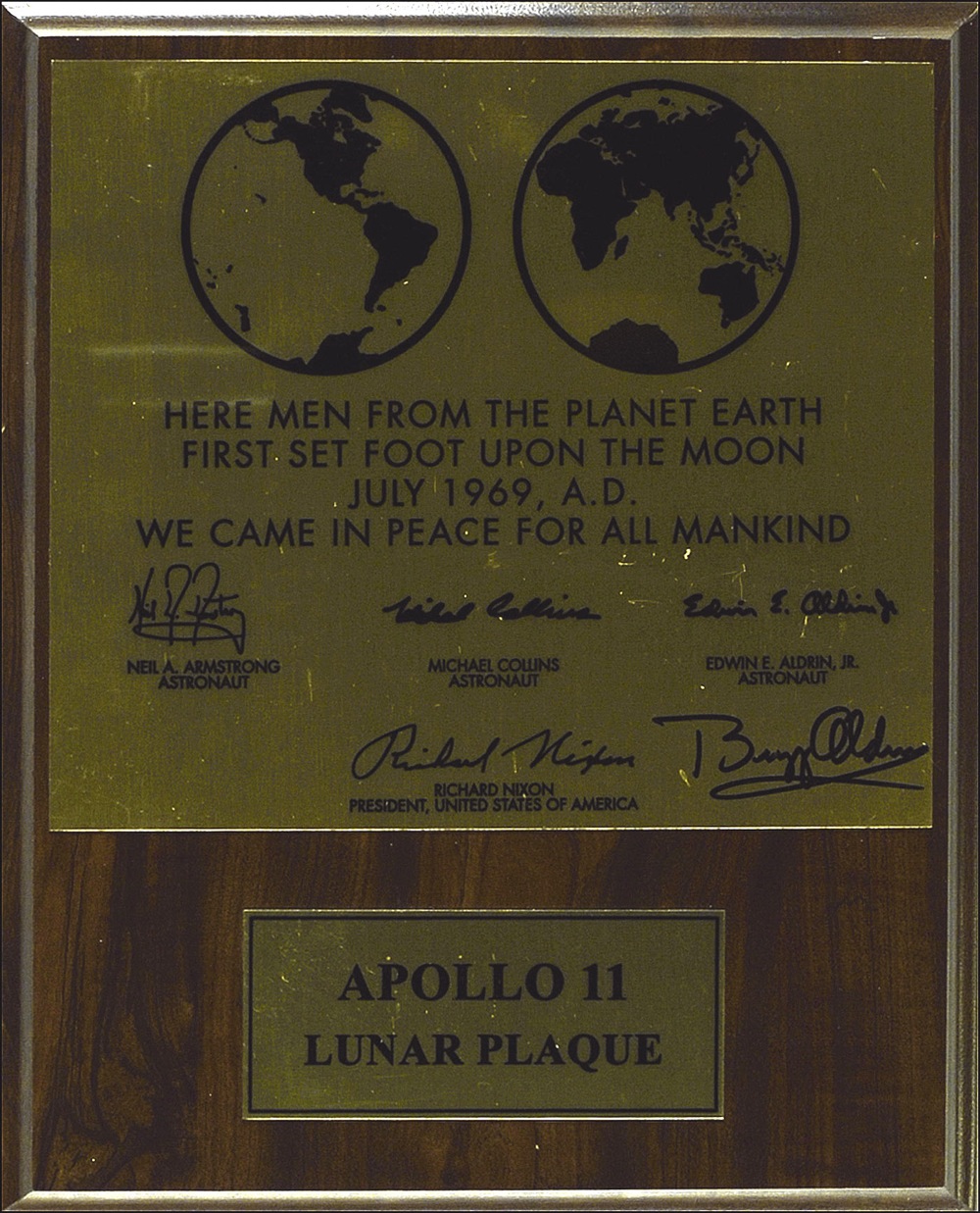 Replica 10.5 x 13 plaque honoring the crew of the Apollo 11 mission. The plaque reads “Here men from the planet Earth first set foot upon the moon July 1969, A. D. We came in peace for all mankind.” The plaque carries facsimile signatures of all three crew members and of Richard Nixon, and has also been signed in black felt tip by Aldrin in the lower right corner. In fine condition, with some scattered light surface dings to plaque. Pre-certified Scott Cornish and RRAuction COA.