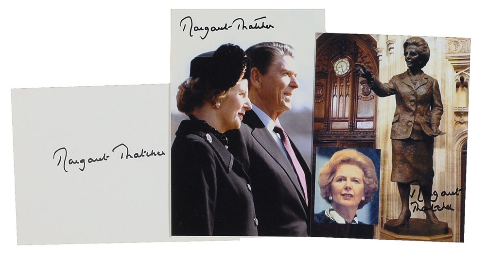 Two color glossy photos, both approximately 4 x 6, each signed in black felt tip; and a felt tip signature on a 6 x 4 white card. In very fine condition. RRAuction COA.