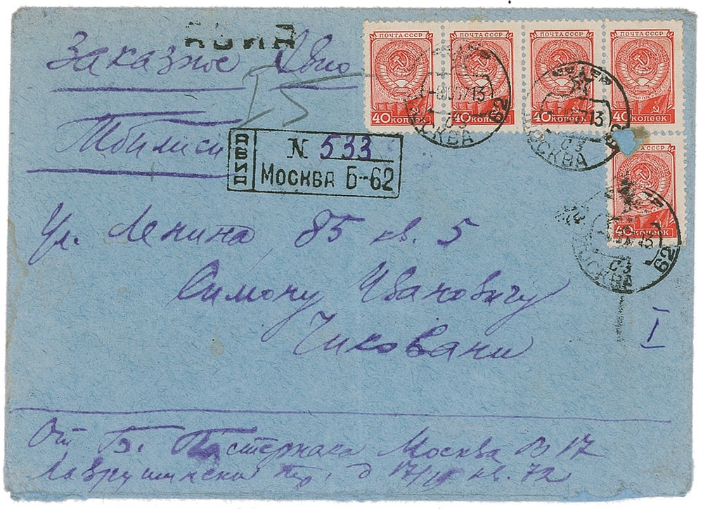 Russian writer (1890–1960) whose novel Doctor Zhivago takes a place among the central works of twentieth-century literature. Hand-addressed mailing envelope, 6.5 x 4.5, addressed in Russian by Pasternak to "To Tbilisi. Lenin's Str., 85 Aprt. 5, Simon Ivanovich Chikovany" and bearing his Moscow return address along the bottom, "From B. Pasternak, Moscow 17, Lavrushensky Str. 17/19, apt. 72." A central vertical fold, scattered light creasing, wrinkling, and soiling, as well as some minor edge wear, otherwise fine condition. RRAuction COA.