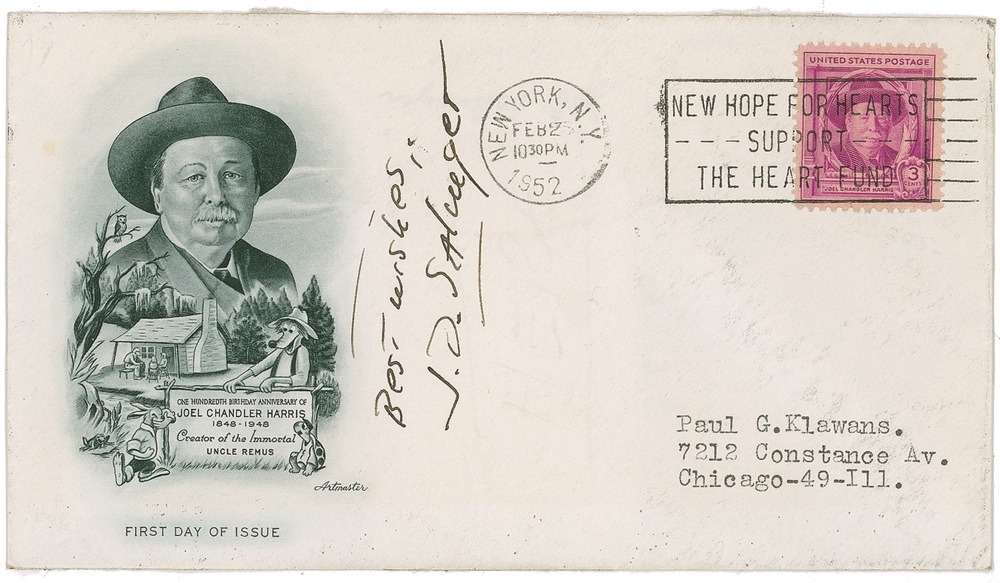 Commemorative cover with a cachet honoring the 100th birthday anniversary of author Joel Chandler Harris, signed vertically in black ink, "Best wishes, J. D. Salinger." Cover bears a typed address to lower right, as well as a February 25, 1952, New York, New York, postmark. Clipped photo and caption affixed to reverse, a vertical fold to front, and some light wrinkles and ripples, otherwise fine condition. Pre-certified John Reznikoff/PSA/DNA and RRAuction COA.