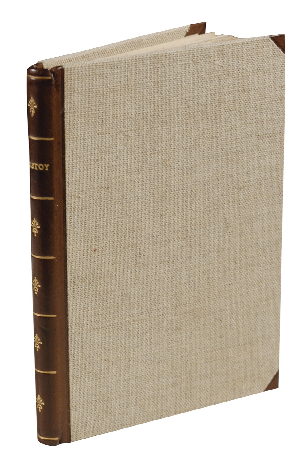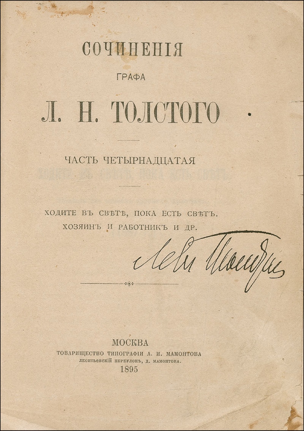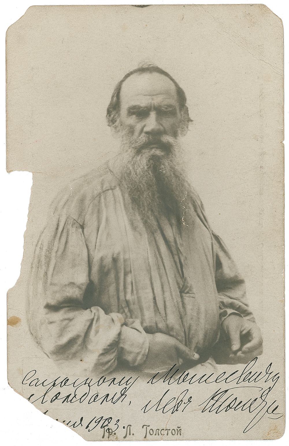 Russian novelist and moral philosopher (1828–1910) best known for his epic novels War and Peace and Anna Karenina. Two items: Scarce vintage 3.5 x 5.5 postcard photo, signed and inscribed in black ink, in Russian, "To Solomon Moiseevich, London, June 1903. Leo Tolstoy." Paper loss to left edge and lower left corner affecting a single word to Tolstoy's writing (most likely his location), trimmed top corner tips, some light creases, and a couple small spots of toning, otherwise very good condition; and a rebound hardcover Tolstoy work, in Russian, signed on the title page in black ink by Tolstoy. Book has creasing, soiling, and toning to signed page, light soiling and foxing to some of the inside pages, wear and chipping to fore-edges and bottom edges. A desirable image of one of the world's greatest novelists, signed at the time when a dramatic adaptation of his 'Resurrection' was all the rage on the London stage. Pre-certified John Reznikoff/PSA/DNA and RRAuction COA.