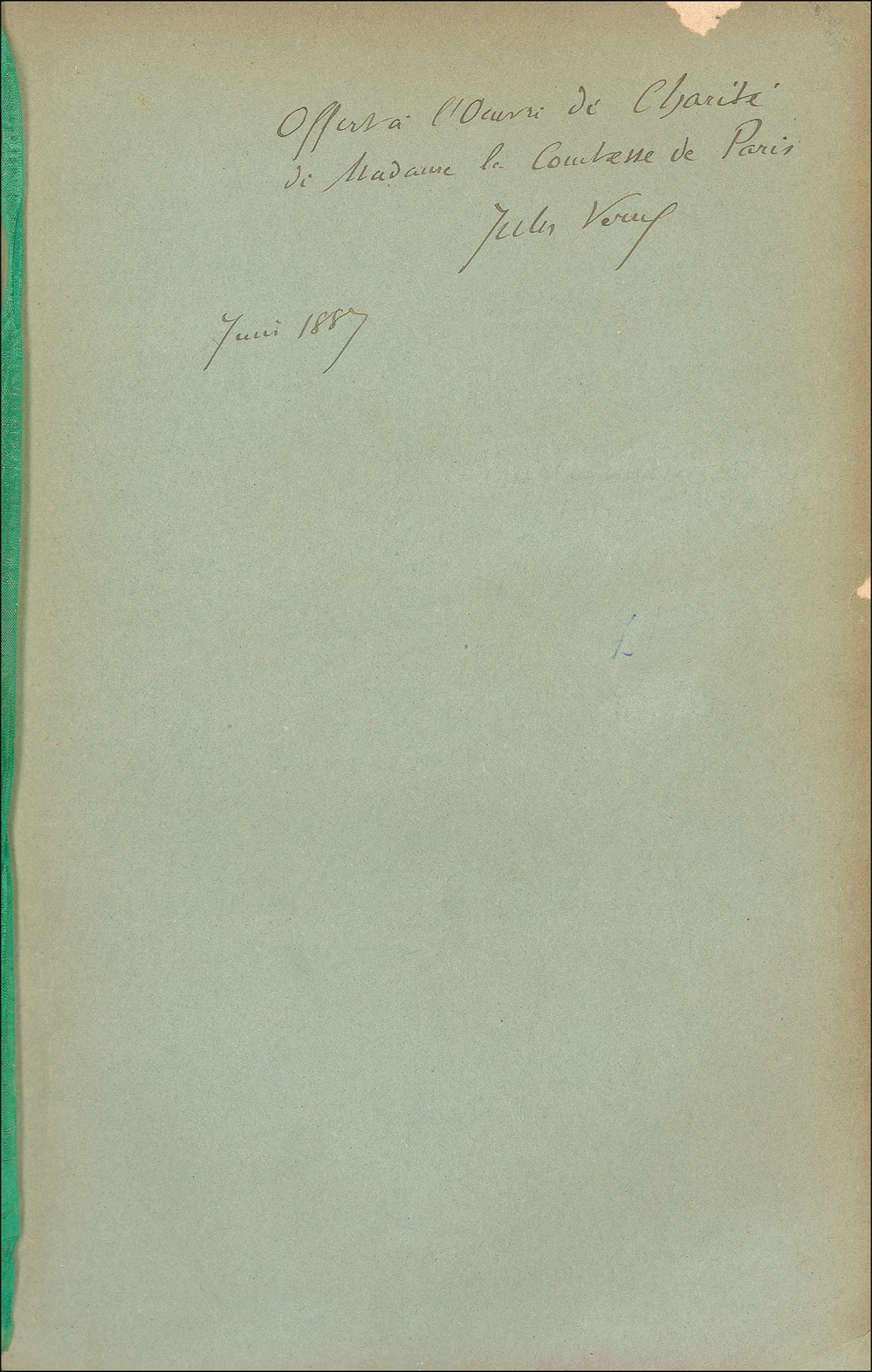 Signed book: Voyages Extraordinaires Kéraban-le-têtu (in French). Paris: J. Hetzel. Hardcover, 7.25 x 11, 410 pages. Signed and inscribed, in French, on the first free end page (translated): "Offered for charity sponsored by the Countess of Paris. Jules Verne. June 1887." In good to very good condition, with separation along front hinge, mild toning and edge chipping to signed page, light toning and foxing to inside pages, partial separations to last few pages, as well as some light page warping and rippling. Cover exhibits overall wear, with surface loss to front cover, slight fraying to joint, as well as some mild sunning and fading.