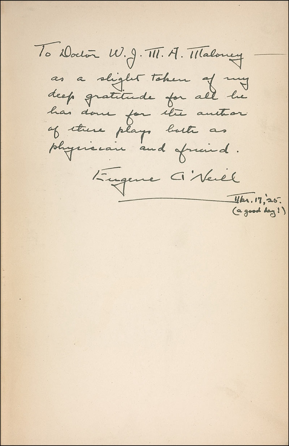 American playwright (1888–1953) who occupies a central place in the history of twentieth-century drama. Among his most famous works are The Iceman Cometh, Mourning Becomes Electra, and Long Day's Journey into Night. A four-time winner of the Pulitzer Prize, he was also awarded the Nobel Prize in Literature in 1936. Signed book: Collected Plays of Eugene O'Neill Volume I. NY: Boni and Liveright, 1924. Hardcover, 6 x 9, 502 pages. Signed and inscribed on the first free end page, "To Doctor W. J. M. A. Maloney-as a slight token of my deep gratitude for all he has done for the author of these plays both as physician and friend. Eugene O'Neill, Mar. 17, '25 (a good day!)" Also signed a second time by O'Neill on the limitations page. In very good condition, with some scattered toning to first free end page, small separation along back hinge, spine loose but intact, surface loss to two corner tips, scattered toning and rubbing to covers and spine, as well as light fraying to the spine's head and tail. A nice doubly-signed warm presentation, with a subtle nod to his penchant for drink. Pre-certified PSA/DNA and RRAuction COA.