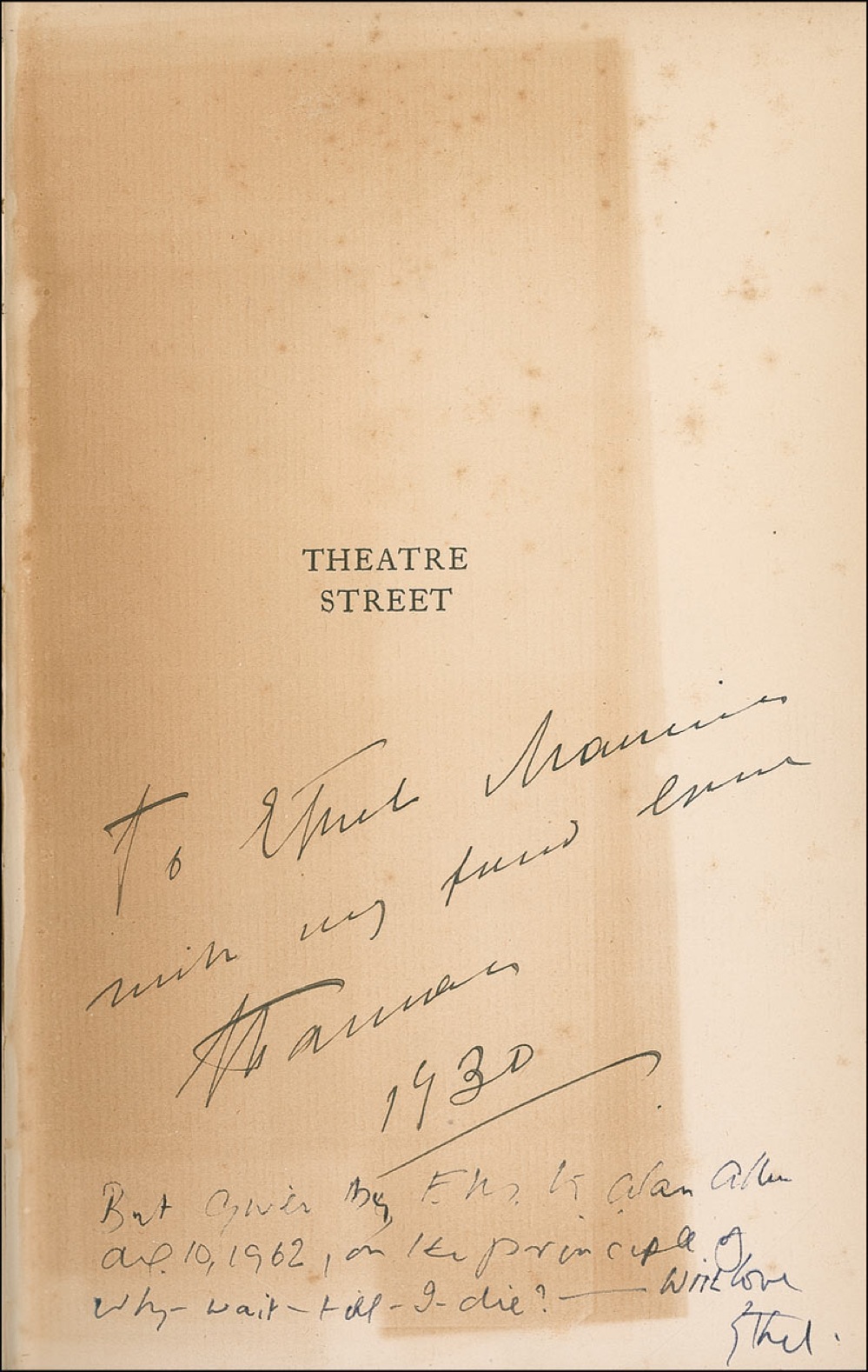 Russian ballerina (1885-1978), renowned for her beauty, who was most noted as a Principal Artist of the Imperial Russian Ballet and later the Ballets Russes of Serge Diaghilev. After settling in England, she began teaching ballet professionally and would become recognized as one of the founders of modern British ballet. Signed book: Theatre Street. Later printing. London: William Heinemann Ltd, 1930. Hardcover, 5.75 x 8.75, 341 pages. Signed and inscribed on the half-title page and dated 1930. In good condition, with moderate block of toning over signature, gift inscription under Karsavina's signature, moderate toning to opening pages, scattered foxing to signed page, opening and closing pages, and pastedowns, scattered wear and fraying to covers and spine, and some light foxing to fore-edges. Pre-certified PSA/DNA and RRAuction COA.