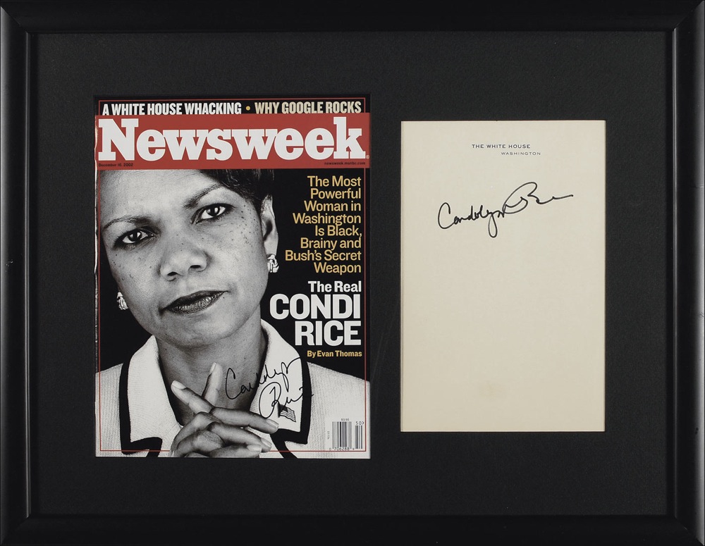 Two items: cover from the December 16, 2002, issue of Newsweek magazine featuring Rice on the cover, signed in black felt tip; and a sheet of embossed White House letterhead, signed in black felt tip. Both are matted and framed together to an overall size of 20 x 16. In fine condition, with mild scattered toning to bottom of sheet. RRAuction COA.
