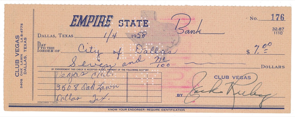 Dallas nightclub owner (1911–1967) who shot and killed Lee Harvey Oswald on November 24, 1963, two days after Oswald was arrested for the assassination of President John F. Kennedy. Business check from Club Vegas, 8.25 x 3, filled out in another hand and signed by Ruby, payable to City of Dallas for $7.00, January 4, 1958. In fine condition with expected stamps and cancellation holes, and show-through from a stamping touching the first two letters of his name. Pre-certified PSA/DNA and RRAuction COA.