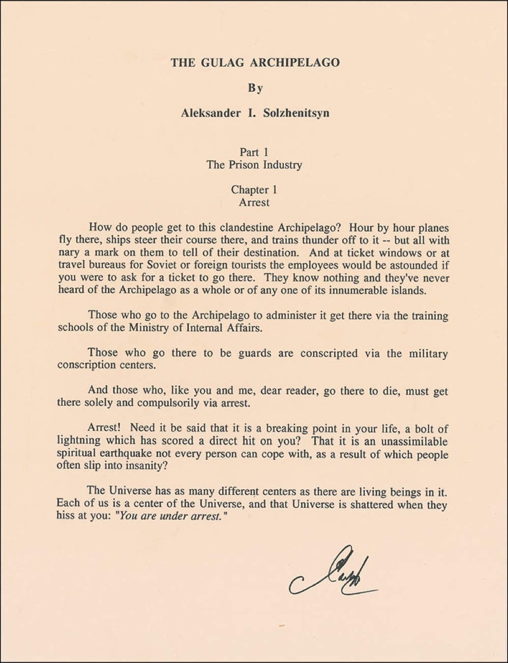 Nobel Laureate in Literature, 1970. Souvenir typescript, one page, 8.5 x 11, of the first page of Chapter One of The Gulag Archipelago, beginning, "How do people get to this clandestine Archipelago?…those, like you and me dear reader, go there to die, must get there solely and compulsorily via arrest." Signed at the bottom in black ink. In fine condition. A fine memento of a powerful work that changed many people's perspective of Lenin. RRAuction COA.