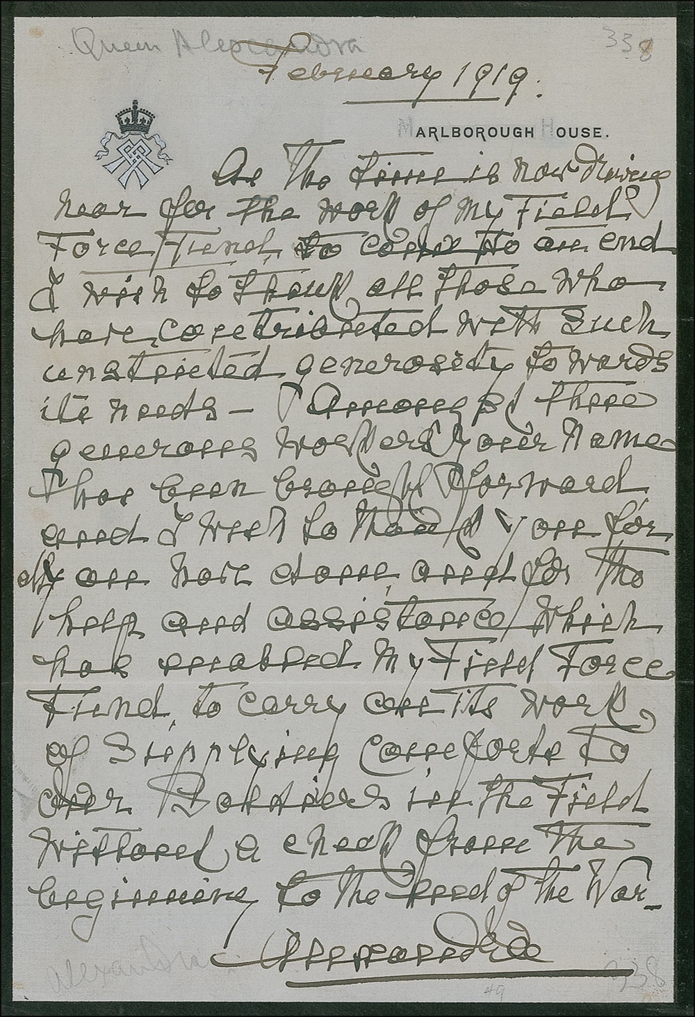 Queen Consort to Edward VII of England (1844–1925) and mother of George V. ALS signed "Alexandra," one page, 6.5 x 9.25, black-bordered Marlborough House letterhead, February 1919. Letter in her difficult to decipher hand, which appears to be a general letter of thanks, reads, inpart: "As the time is now drawing near for the work of my Field Force Fiend to come to an end. I wish to thank all those who have contributed with such…generosity towards its needs." In fine condition, with pencil notations to top and bottom edge, and a bit of scattered light toning and soiling. RRAuction COA.