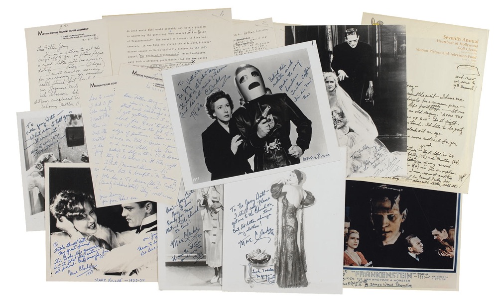 Twenty items: Interesting Hollywood archive from the film actress sent to a single collector, consisting of 14 photos (most glossy 8 x 10); four ALSs, a photocopy of a 1986 New York Post front page announcing James Cagney's death, and a three-page draft of an article with numerous handwritten corrections from Clarke. The photographs are inscribed with lengthy thoughts, and two carry a lengthy note on the reverse. Among the more interesting comments is a scene from the 1933 film Lady Killer as Cagney pulls at her hair: "This is NOT a wig I tell you. Let go-I want my ear back!" Another comment on a photo of the famous grapefruit scene in 1931's Public Enemy reads: "What can I tell you? It was wet!" Another photo from Frankenstein is signed and inscribed on the front "From Mae Clarke, U.S.A, 'Elizabeth' betrothed to Doctor F. (Colin Clive U.K)" and has a lengthy and interesting commentary on the reverse discussing the film. The ALSs, from the mid-1980s, discuss her career, co-stars, and family. In overall very good to fine condition. An eclectic display. RRAuction COA.