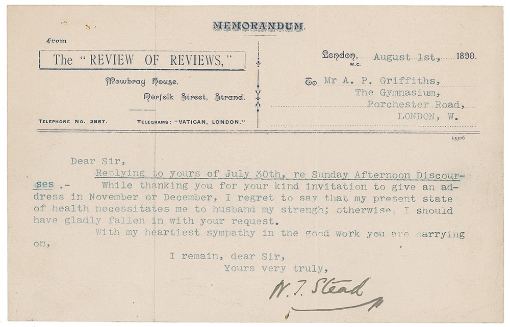 Journalist (1849–1912) and assistant editor of the Pall Mall Gazette famous for his anti-vice crusade and founder of The Review of Reviews who drowned in the Titanic disaster. He is widely considered to be the founder of modern journalism. TLS signed "W. T. Stead," one page, 8 x 5, 'The Review of Reviews' memorandum letterhead, August 1, 1890. In full: "Replying to yours of July 30th, re Sunday Afternoon Discourses. While thanking you for your kind invitation to give an address in November or December, I regret to say that my present state of health necessitates me to husband my strength; otherwise, I should have gladly fallen in with your request." Scattered creasing, wrinkling, and a vertical fold passing through his name, otherwise fine condition.