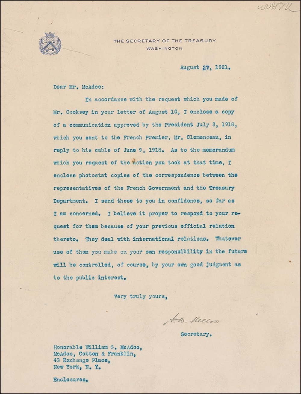 Financier and philanthropist who helped found the Gulf Oil Corporation; he also served as treasury secretary under Harding, Coolidge, and Hoover. TLS signed "A. W. Mellon," one page, 8 x 10.5, The Secretary of the Treasury letterhead, August 27, 1921. Mellon writes his predecessor, William G. McAdoo, concerning Treasury matters. In full: "In accordance with the request which you made of Mr. Cocksey in your letter of August 10, I enclose a copy of a communication approved by the President July 3, 1918, which you sent to the French Premier, Mr. Clemenceau, in reply to his cable of June 9, 1918. As to the memorandum which you request of the action you took at that time, I enclose photostat copies of the correspondence between the representatives of the French Government and the Treasury Department. I send these to you in confidence, so far as I am concerned. I believe it proper to respond to your request for them because of your previous official relation thereto. They deal with international relations. Whatever use of them you make on your own responsibility in the future will be controlled, of course, by your own good judgment as to the public interest." Light creasing, wrinkling, and a few spots of soiling, otherwise fine condition.