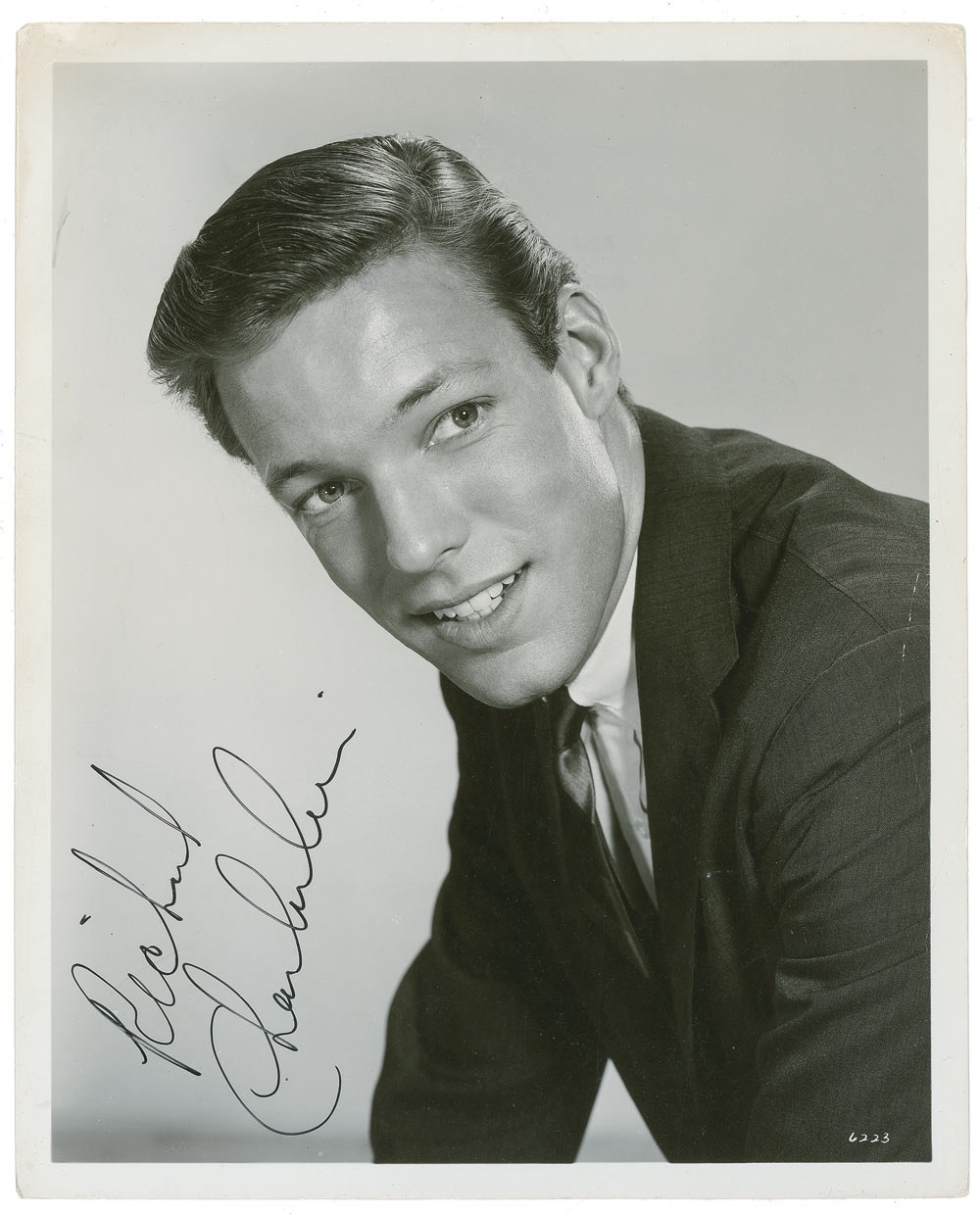 Vintage glossy 8 x 10 photo of a young Chamberlain in a jacket and tie, signed later in black felt tip. In very good condition, with scattered creases, surface marks, and impressions. Pre-certified PSA/DNA and RRAuction COA.