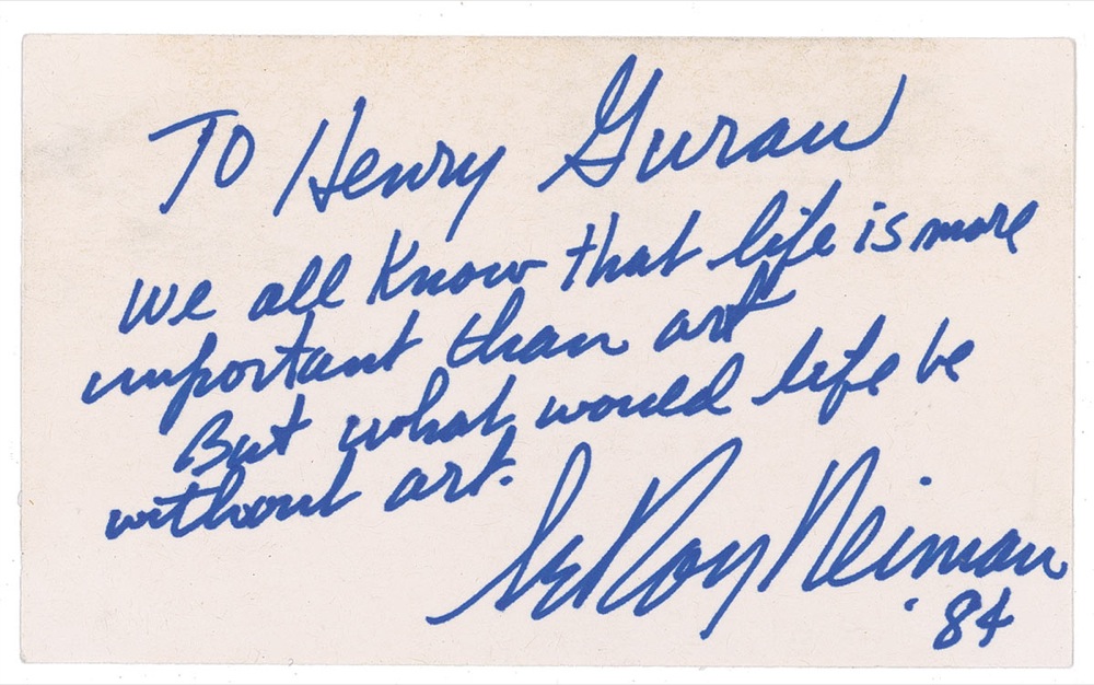 AQS, signed "LeRoy Neiman '84," on an off-white 5 x 3 card. Neiman writes: "To Henry Guran, We all know that life is more important than art, But what would life be without art." In fine condition. RRAuction COA.