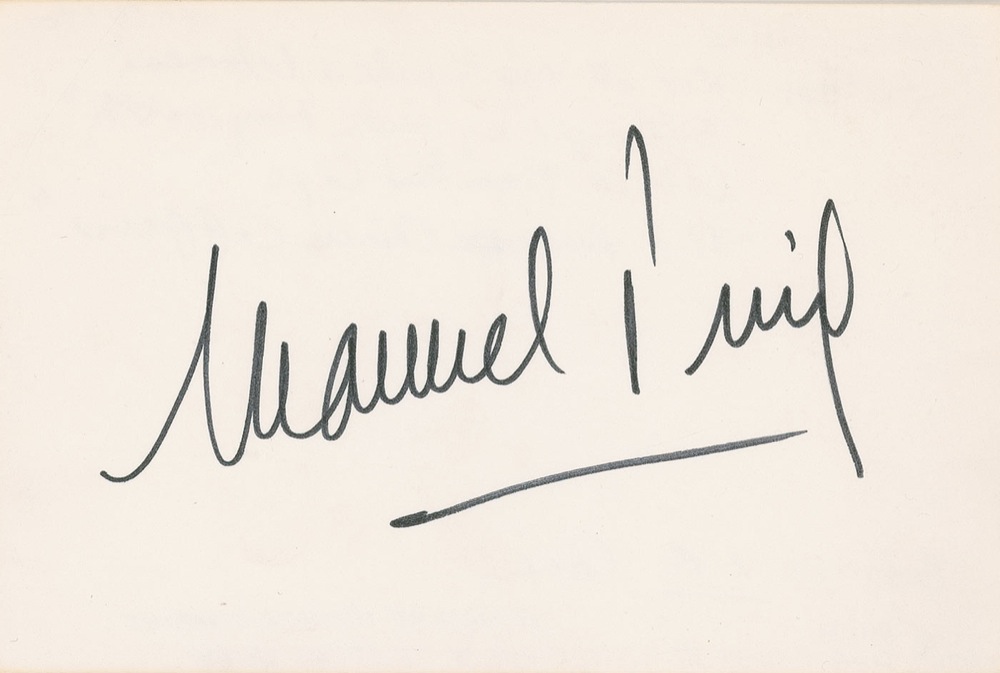 Argentine author (1932-1990) who wrote Kiss of the Spider Woman and Betrayed by Rita Hayworth. Large felt tip signature, "Manuel Puig," on an off-white 6 x 4 card. In fine condition. RRAuction COA.