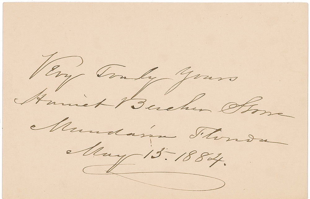 Ink signature, "Very truly yours, Harriet Beecher Stowe, Mandarin, Florida, May 15, 1884," on an off-white 4.5 x 3 card. In fine condition, with a uniform shade of mild toning. Accompanied by the original mailing envelope. RRAuction COA.