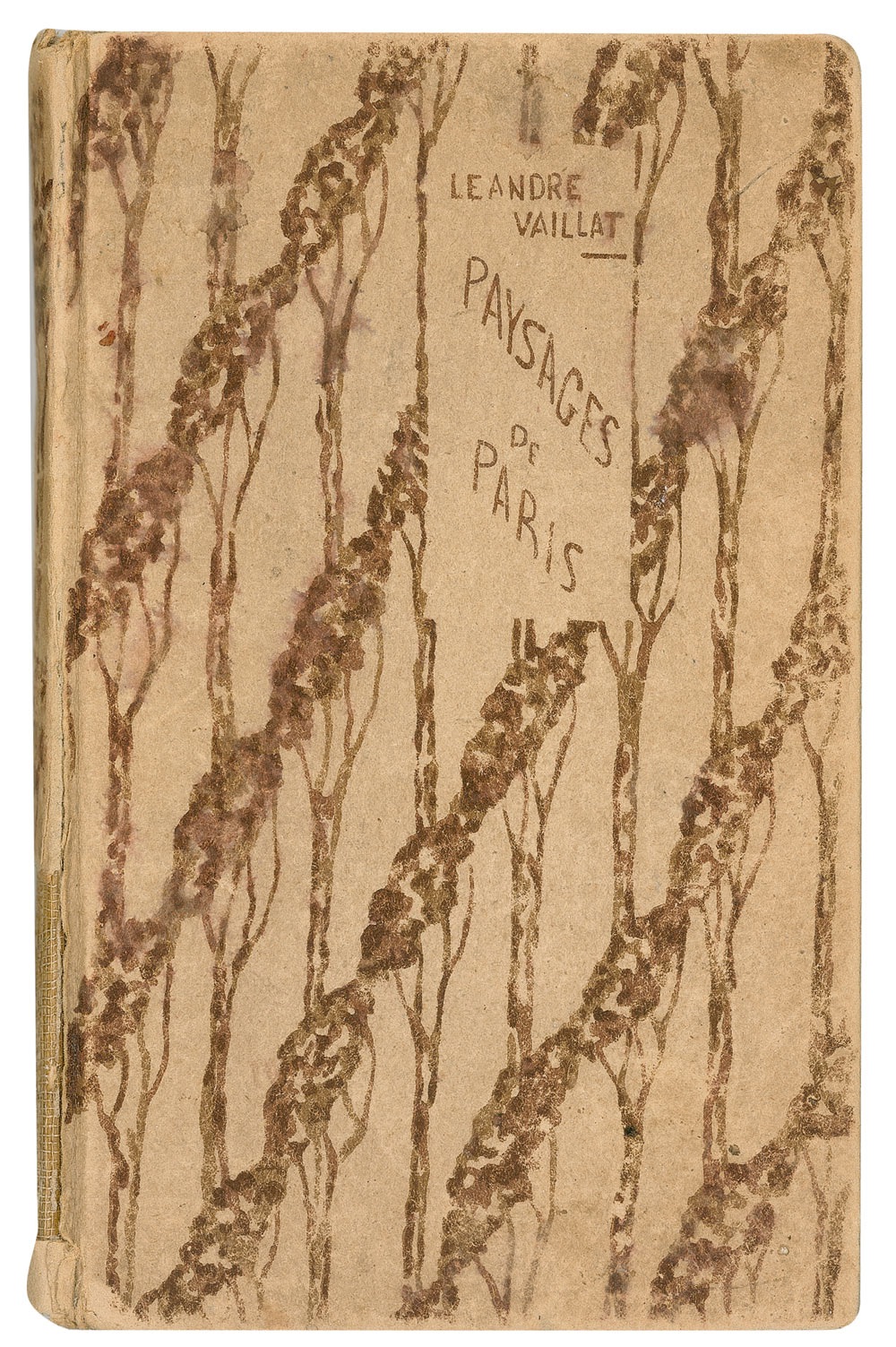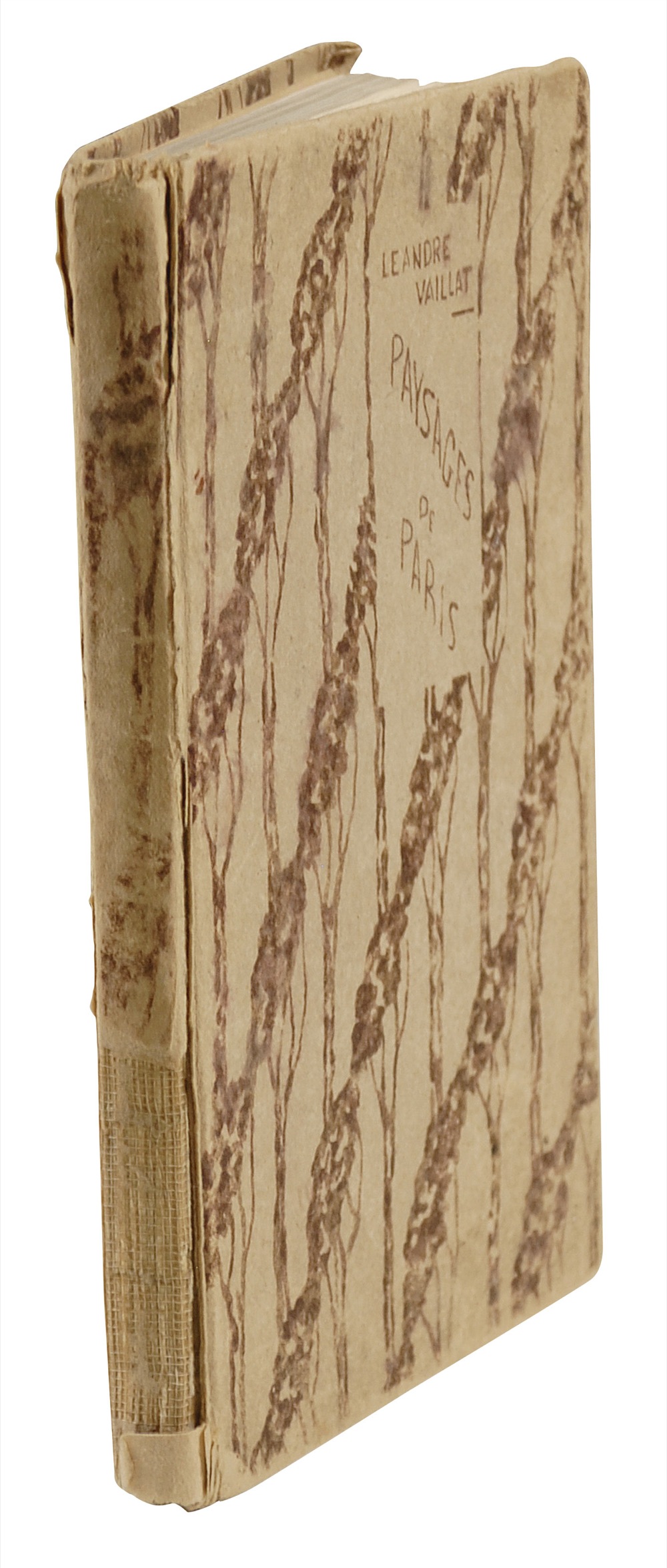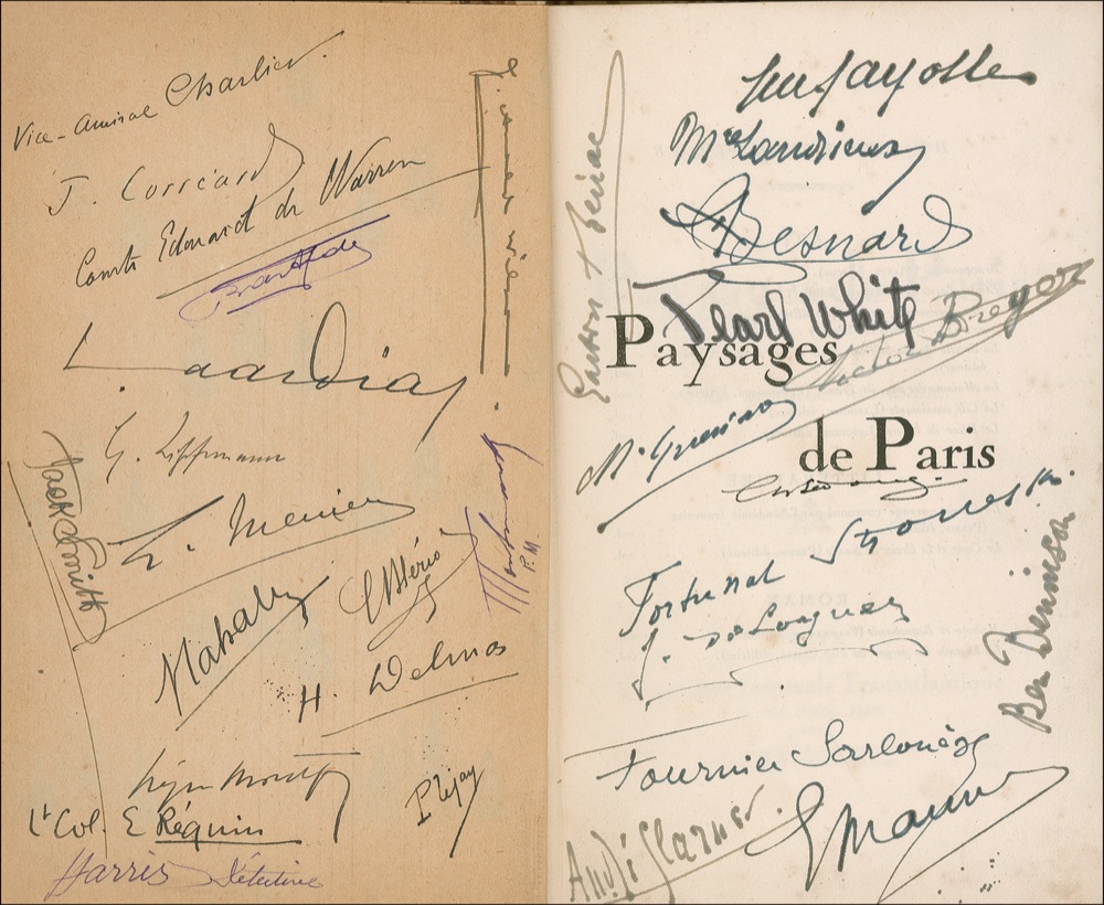 Signed book: Paysages de Paris. Paris: Compaigne Generale Transatlantique, 1921. Hardcover, 5.5 x 8.75, 144 pages. Signed in fountain pen on the reverse of the first free end page and half-title page by thirty passengers on the Paris's maiden voyage, including: Pearl White, Louis Bleriot, Albert Besnard (impressionist painter), Pierre Lejay (physician), 'Whispering' Jack Smith (popular singer of the day), Fortunat Strowski, John Dal Piaz (president of the French Line company), and the ship's captain, Commandant Ernest Maurras. In very good condition, with loose spine, toning and foxing to inside pages (including signed pages), ink notation to front pastedown, wear to covers, partial separation along front hinge, and partial paper loss to spine and external hinges. RRAuction COA.