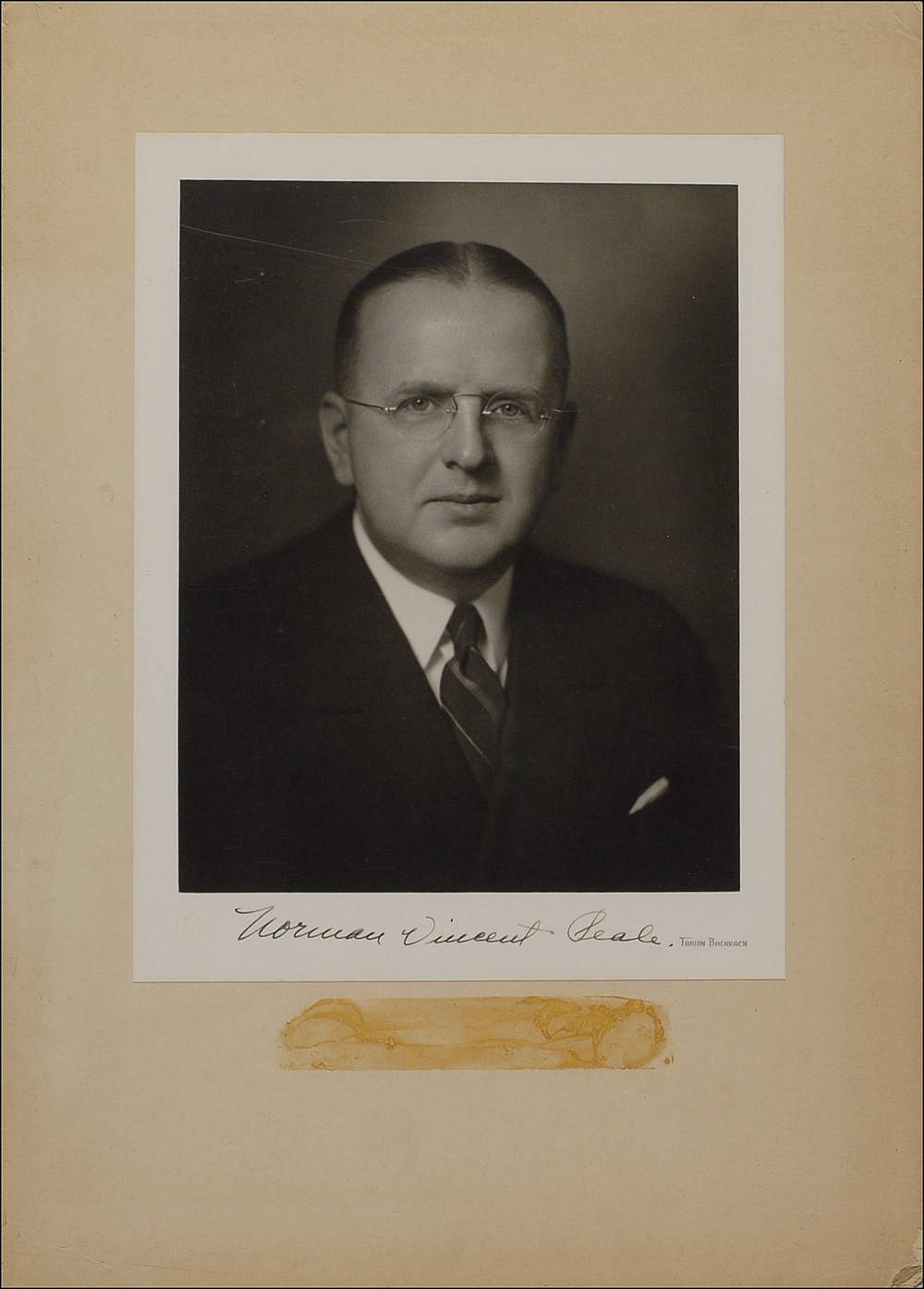 Protestant preacher and author (1898–1993) best known for his self-help best-seller The Power of Positive Thinking. Vintage matte-finish 8.5 x 11 Bachrach photo, signed in the lower border in fountain pen. Photo is affixed to a 12 x 17 piece of heavier cardstock. In fine condition. RRAuction COA.