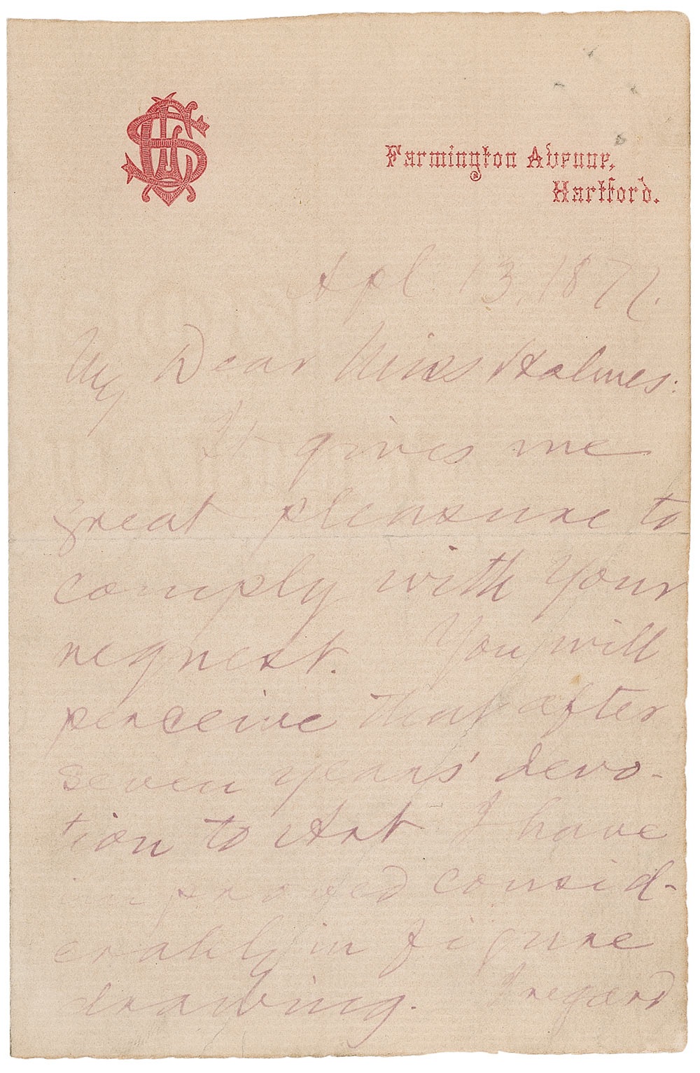 As Clemens wrote this letter, he deprecated his artistic ability with a slight jab at President Hayes. The "Miss Holmes" referred to here could be the English illustrator, watercolor artist and teacher Rhoda Holmes, who later married Burr H. Nicholls and moved to New York City. The humorist, who traveled extensively, spent part of 1871 in London and possibly could have met the artist while abroad.
