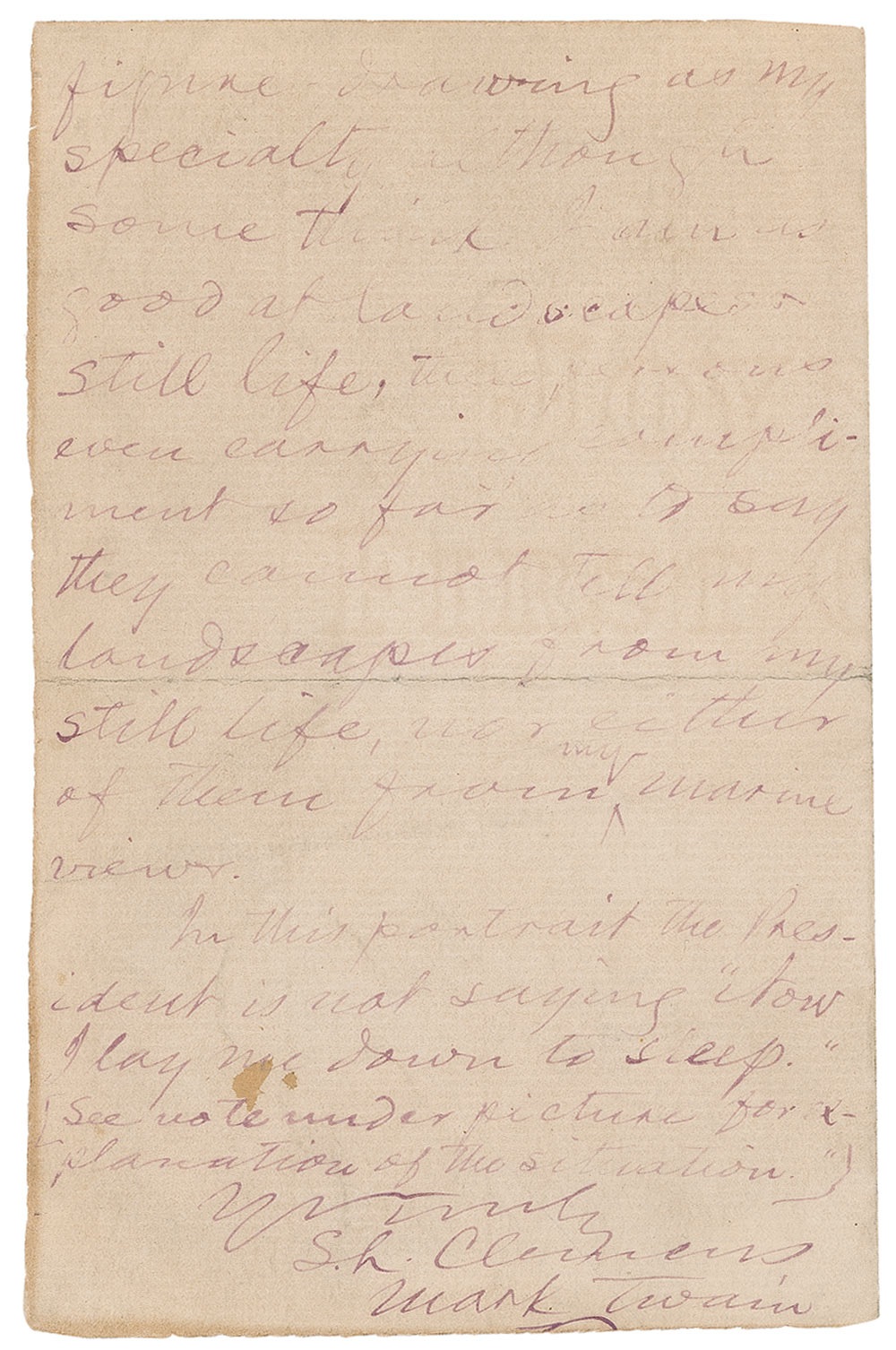 ALS signed “S. L. Clemens, Mark Twain,” two pages, 4.5 x 7, personal letterhead, Hartford, April 13, 1877. Letter to Miss Holmes. In full: “It gives me great pleasure to comply with your request. You will perceive that after seven years' devotion to Art I have improved considerably in figure drawing. I regard figure-drawing as my specialty although some think I am as good at landscapes & still life, these persons even carrying compliment so far as to say they cannot tell my landscapes from my still life, nor either of them from my marine views. In this portrait the President is not saying ‘Now I lay me down to Sleep.’ (See note under picture for explanation of the situation.)” The picture is not present. In very good condition, with text somewhat faded but still legible, a central horizontal fold, staple holes to top right, and a uniform shade of mild toning.