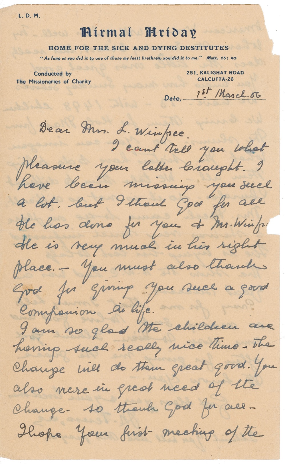 Early ALS signed "M. Teresa mc," one page both sides, 5.5 x 9, Nirmal Hriday (Pure Heart) Home For the Sick and Dying Destitutes letterhead, March 1, 1956. Letter to Mrs. Winfree. In full: "I can't tell you what pleasure your letter brought. I have been missing you such a lot, but I thank God for all he has done for you & Mr. Winfree. He is very much in his right place-You must also thank God for giving you such a good companion in life. I am so glad the children are having such a really nice time. The change will do them great good. You also were in great need of the change. Your first meeting of the American Women will get on well. Try to have the Sunday School, this really does the little ones good. You know how many Sunday schools we have-13-with 1498 children. We bring them for Holy Mass from the slums - so you can imagine what the sisters have to do to bring them all. We take them to different churches-so it is not so difficult. Mrs. Meek came to see our place & she was very much impressed. She is trying her best to help. The show the H.W.C. had was a great success. Pray for me that I may help as many souls to love God and come closer to Him. I thank God often for giving me the grace to know you. God bless you & your loved ones." After her signature she goes on to add, "I think you will like this prayer." In very good condition, with two small areas of paper loss to right edge, affecting a couple letters of one word, scattered light wrinkling, and several small edge tears.