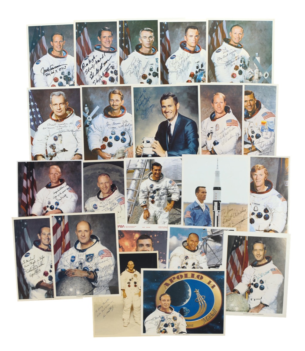 Twenty-two signed NASA photos, various finishes, twenty-one 8 x 10 and one 10 x 8, each signed in ink by the respective astronaut pictured. Signers are: Buzz Aldrin (ins), Jim McDivitt, Gene Cernan (ins), Richard Gordon (adding “We flew to the moon”), Deke Slayton (ins), Rusty Schweickart (ins), Charlie Duke (ins), Ken Mattingly (ins), Alan Bean (ins), Ed Mitchell (ins), Bill Pogue (ins), Walt Cunningham (ins), Fred Haise (ins), Jerry Carr (ins), Bob Crippen (ins), Ed Gibson, Jack Lousma, Owen Garriott (ins), Joe Engle (ins), Al Worden (ins), Tom Stafford (ins), and Paul Weitz. Some astronauts have added their mission assignments. In fine condition, with some some creasing and bends to a few photos. Pre-certified Scott Cornish and RRAuction COA.